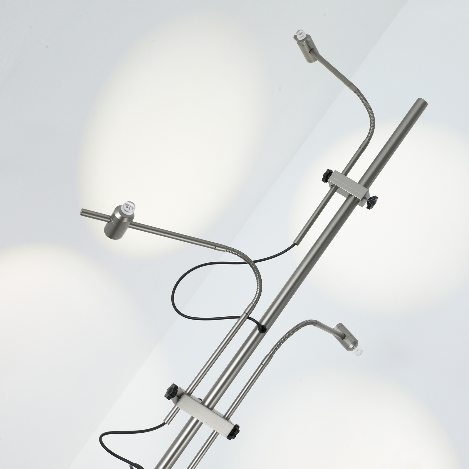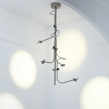 This modern-style pendant light is highly design-oriented. A sturdy silver metal rod hangs vertically from the ceiling, with multiple adjustable curved arms extending asymmetrically from the main rod. Each arm ends with an independent cylindrical lampshade. The overall shape is simple yet full of dynamism, resembling both a glowing tree and an abstract art installation, capable of bringing layered lighting effects to a space.