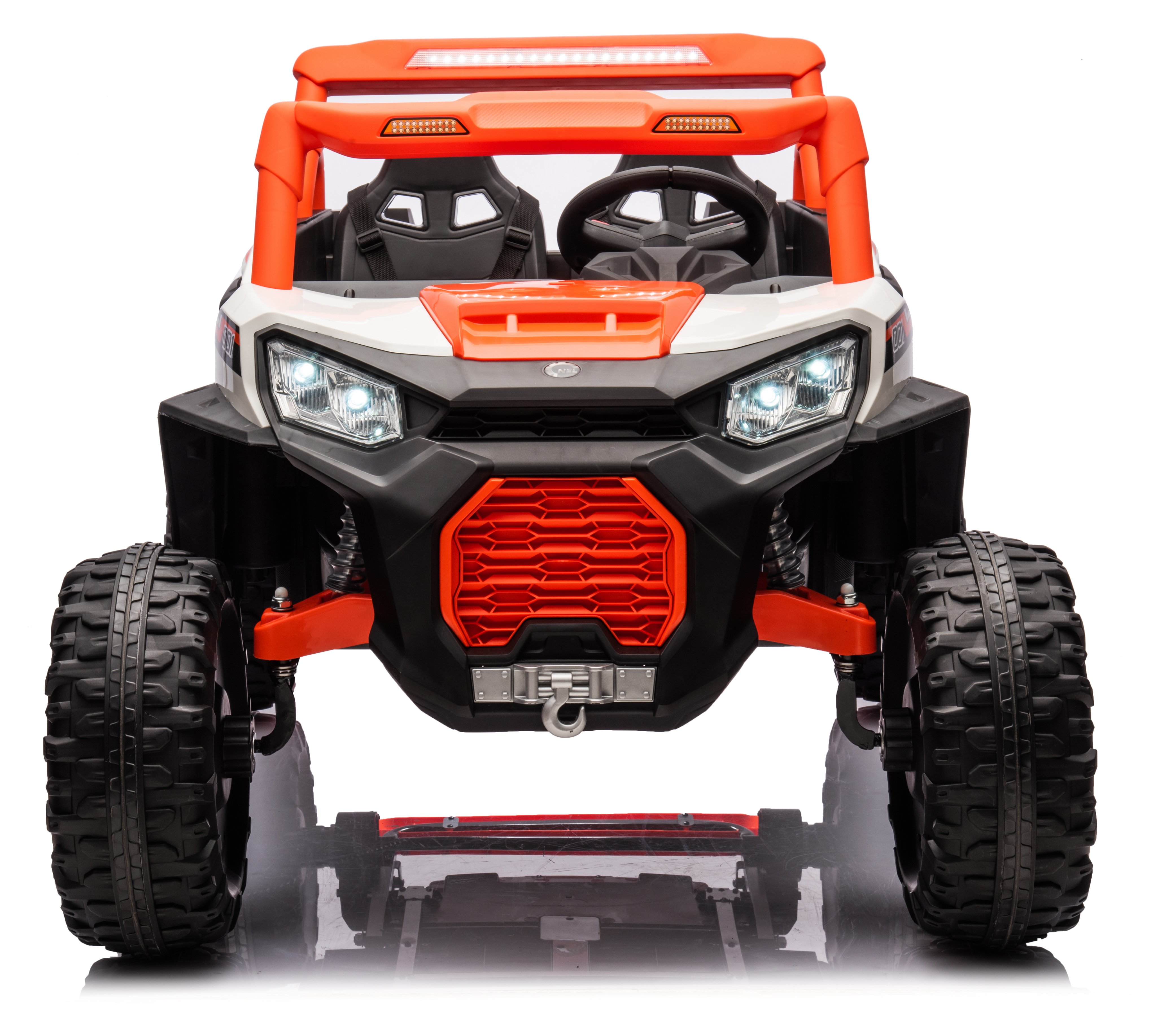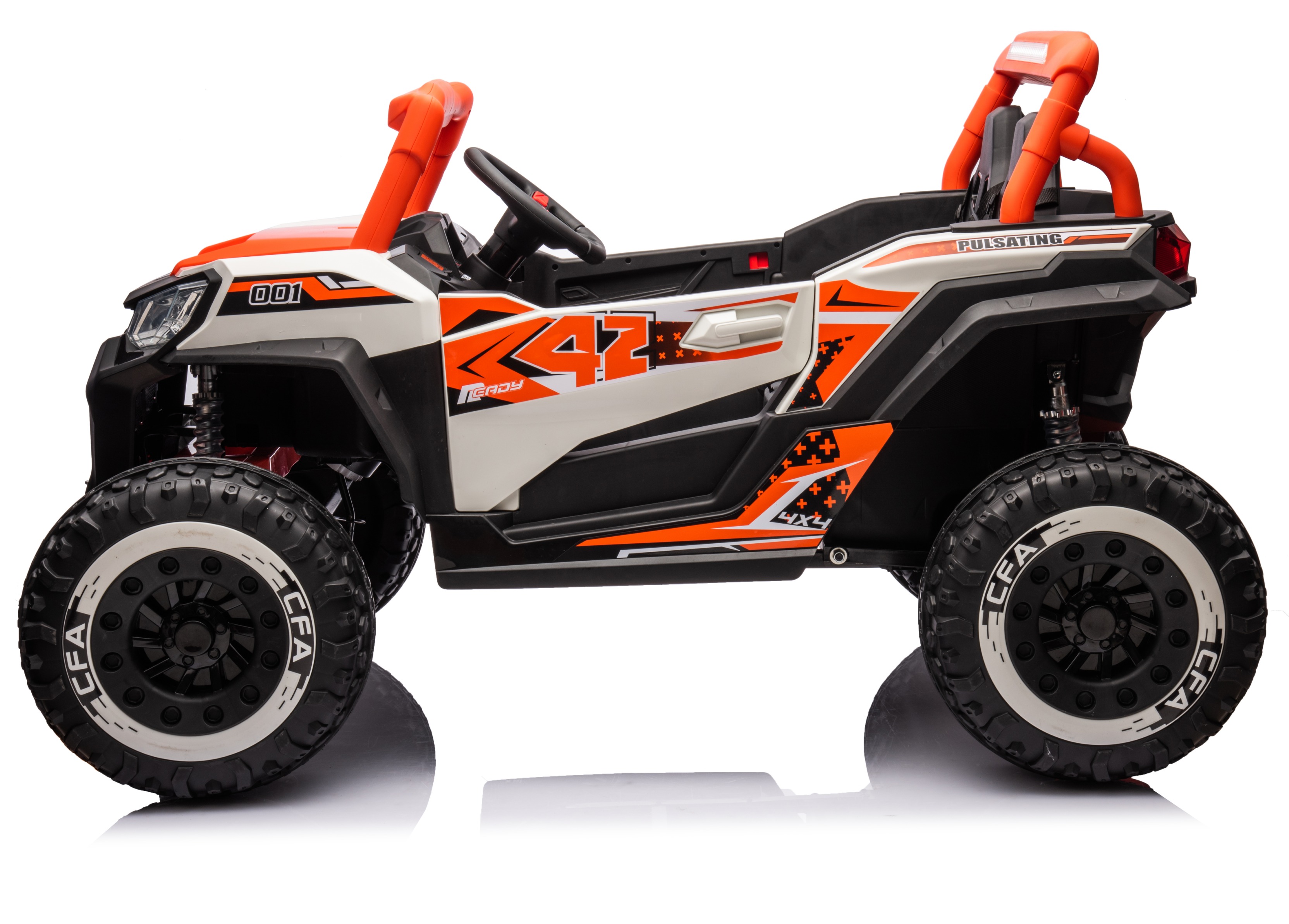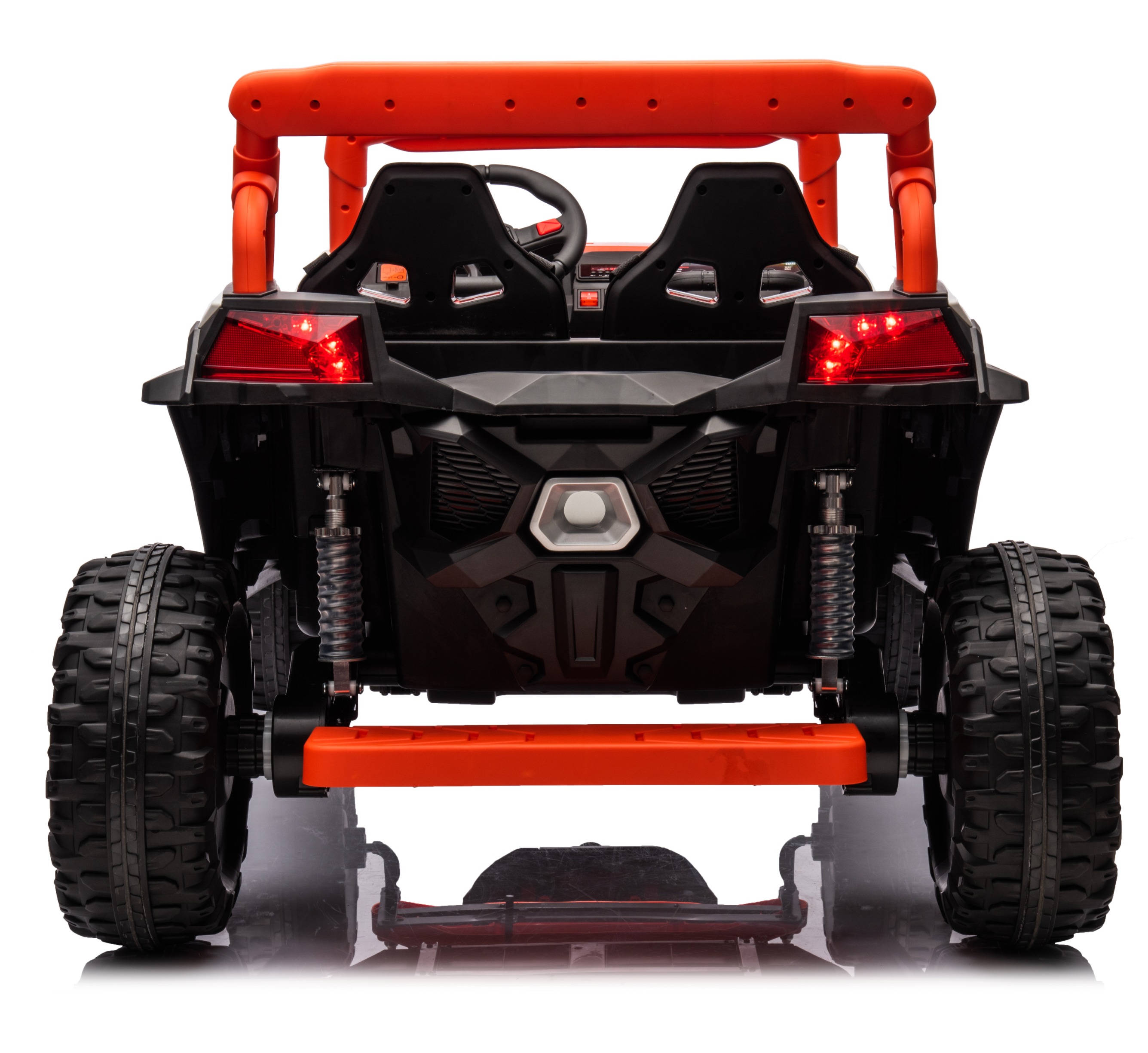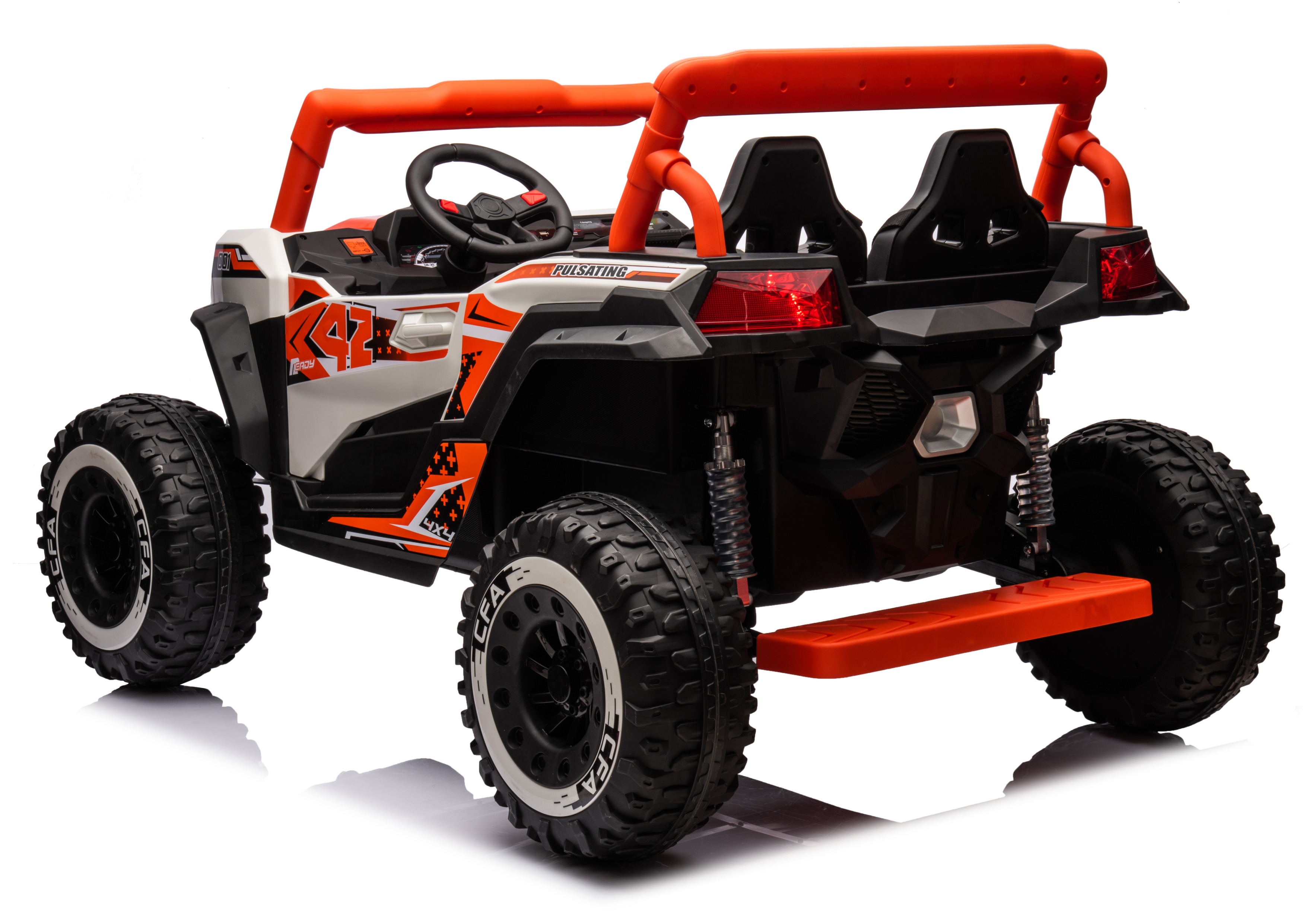 Double doors, 01 power switch, high and low speed, forward and backward, multi-function console, dynamic music, LED lights, with Bluetooth, 2.4G one-to-one Bluetooth remote control, dual seats, safety armrests, four-wheel suspension suspension, parent-child safety pedal