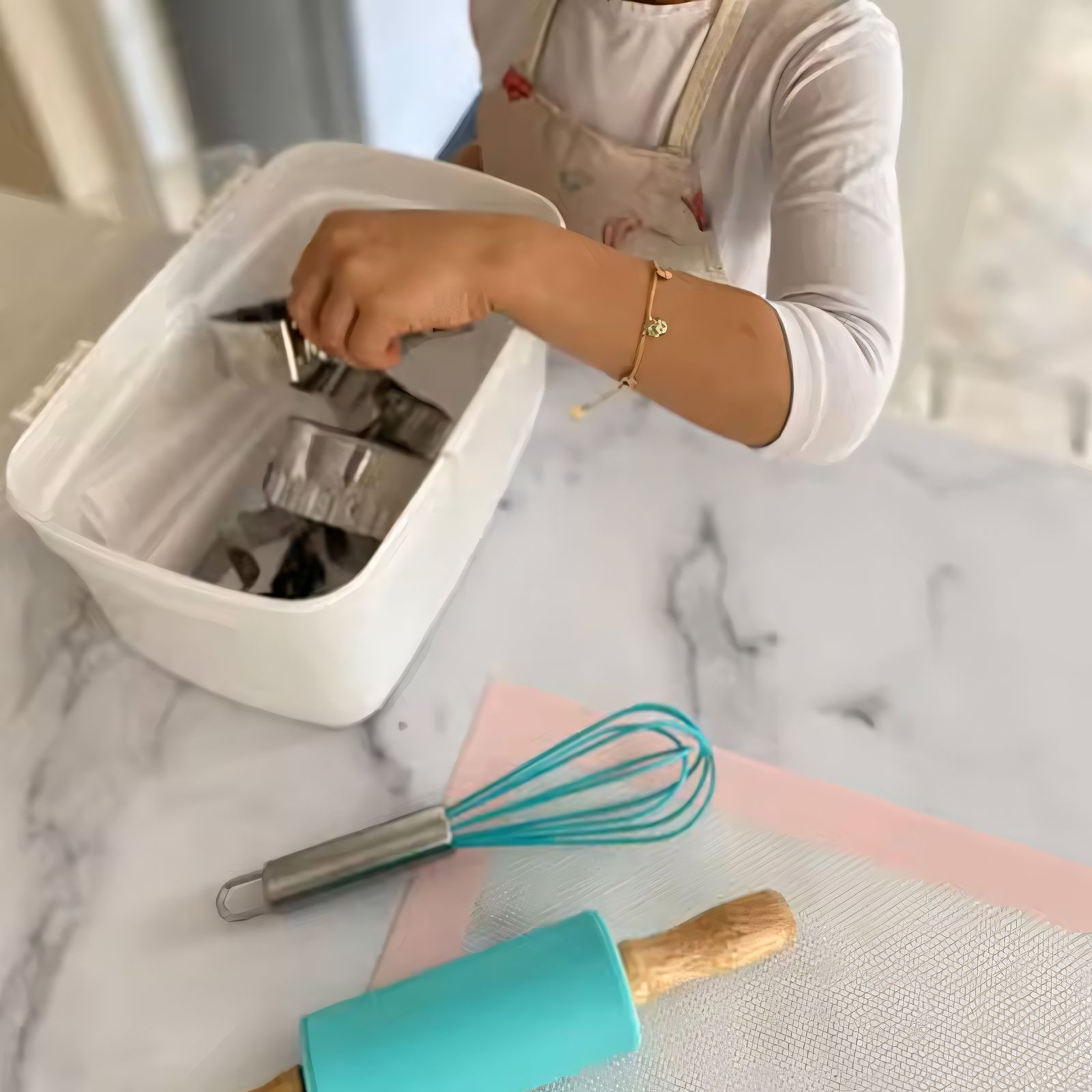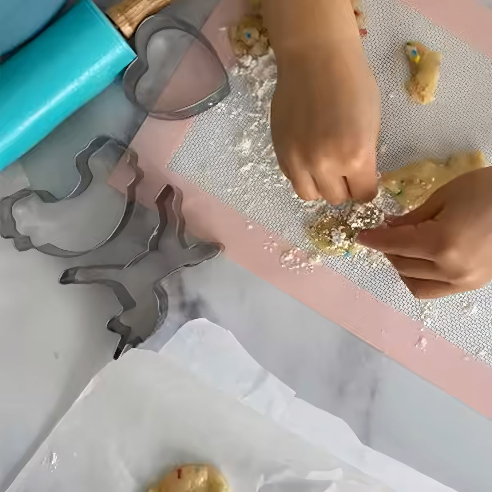 | Shapes | This kids baking set includes 6PCS Piping Bags and Tips Set 1 PCS Kids Apron 1PCS silicone baking mat 1PCS Adjustable Rolling Pin 2PCS scraper 1PCS whisk 6PCS Cookie Cutter in box | Fits For | the perfect gift for kids |
