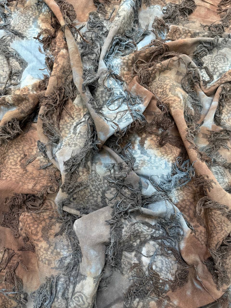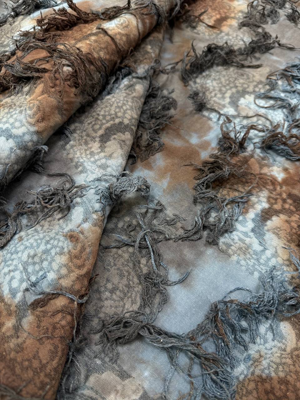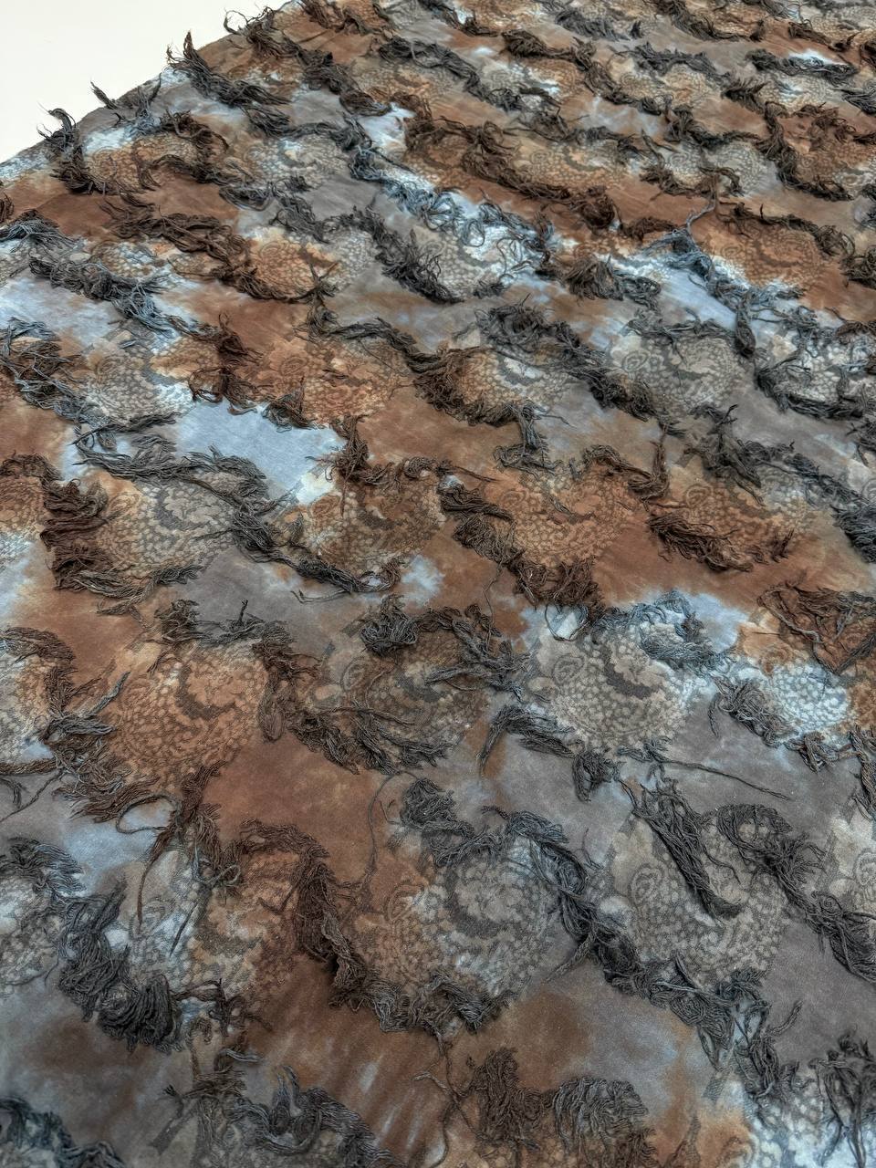 A high-quality material with a natural composition that includes cotton, linen, and viscose embodies the harmony of natural texture and modern design. The fabric is pleasant to the touch, breathable, and ideal for creating comfortable clothing and accessories. A unique monochrome pattern adds expressiveness to the fabric, making each item truly one of a kind. Voluminous, soft threads that rise from the surface create a distinctive texture, adding an extra decorative effect.