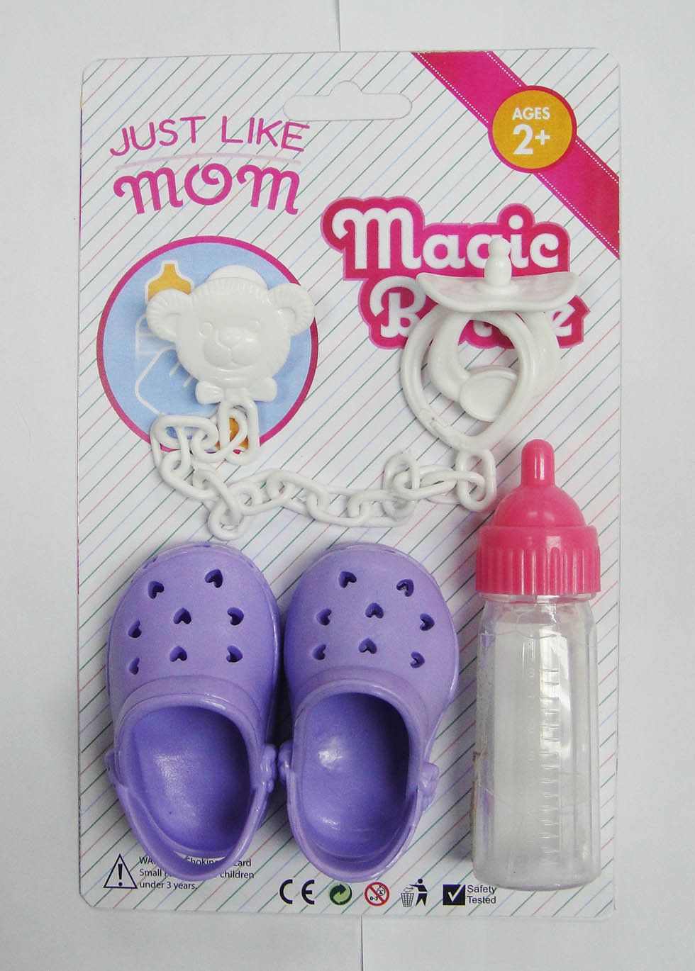 doll accessories on blister card with magic milk bottle and other doll accessories