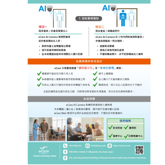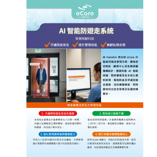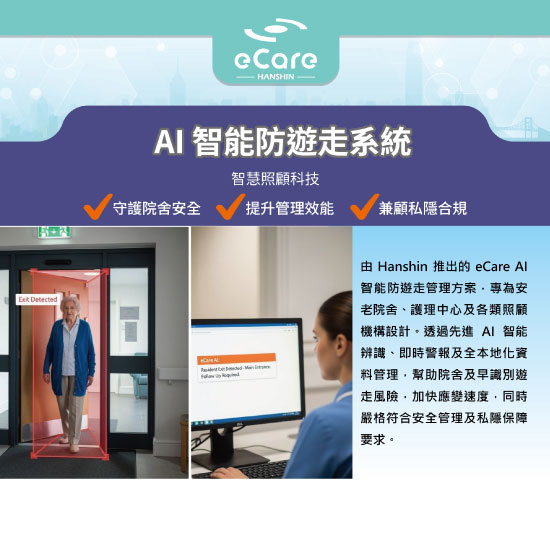 eCare AI Intelligent Wandering Management Solution, launched by Hanshin, is designed specifically for nursing homes, care centers, and various caregiving institutions. Through advanced AI recognition, real-time alerts, and fully localized data management, it helps these facilities identify wandering risks early, speed up response times, while strictly adhering to safety management and privacy protection requirements.