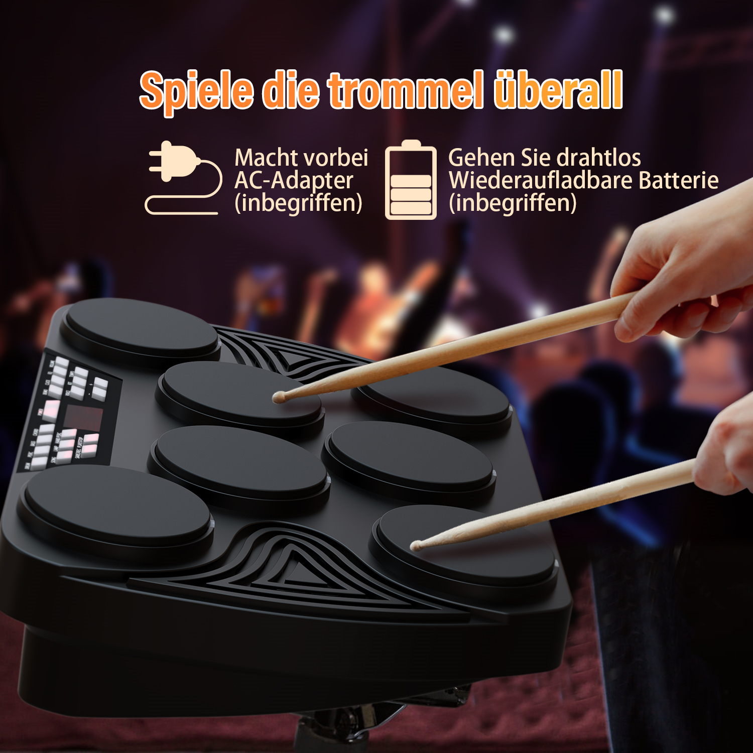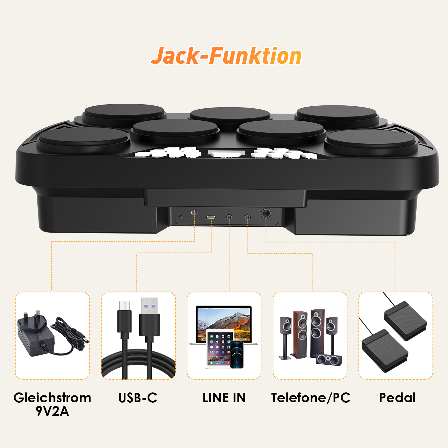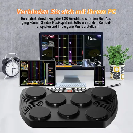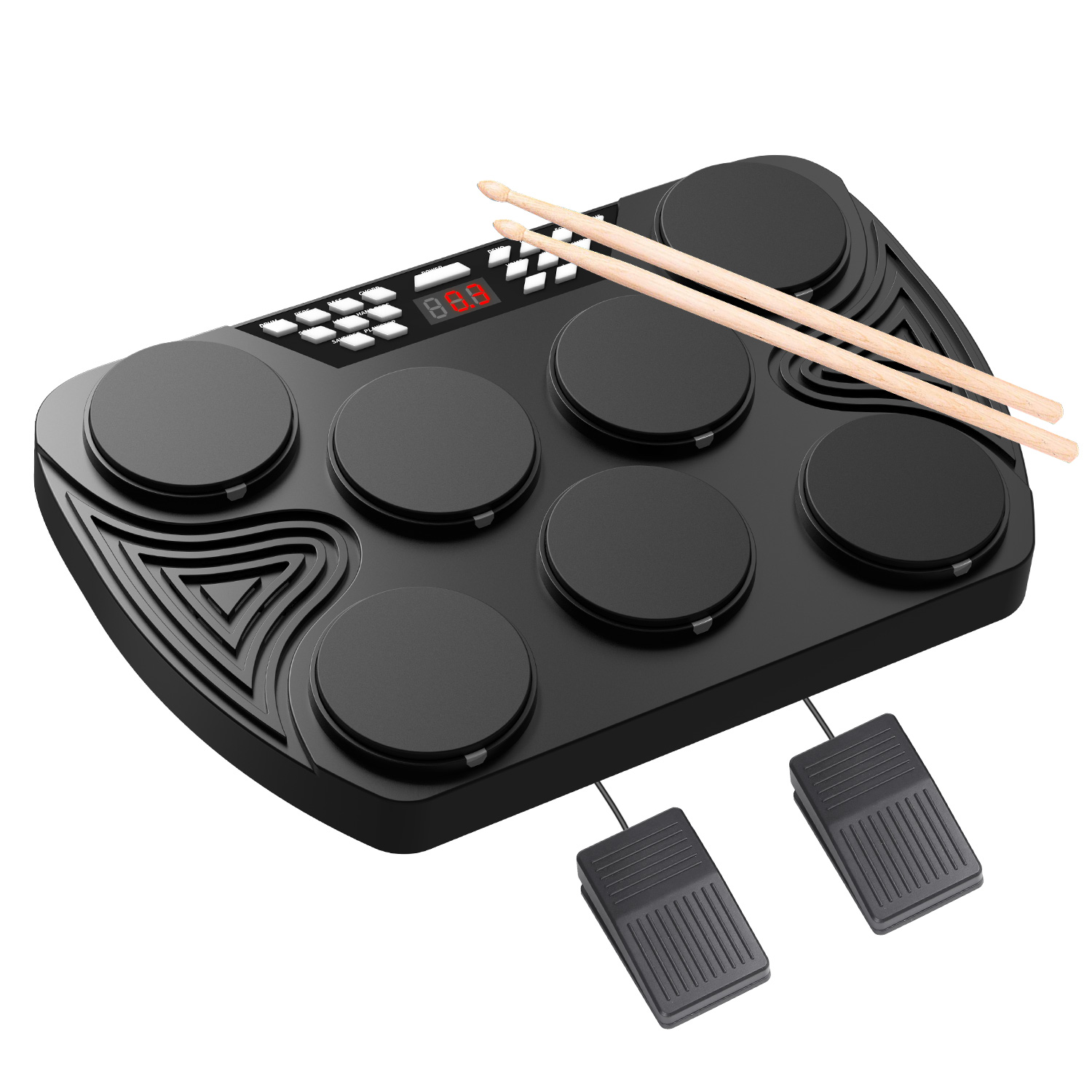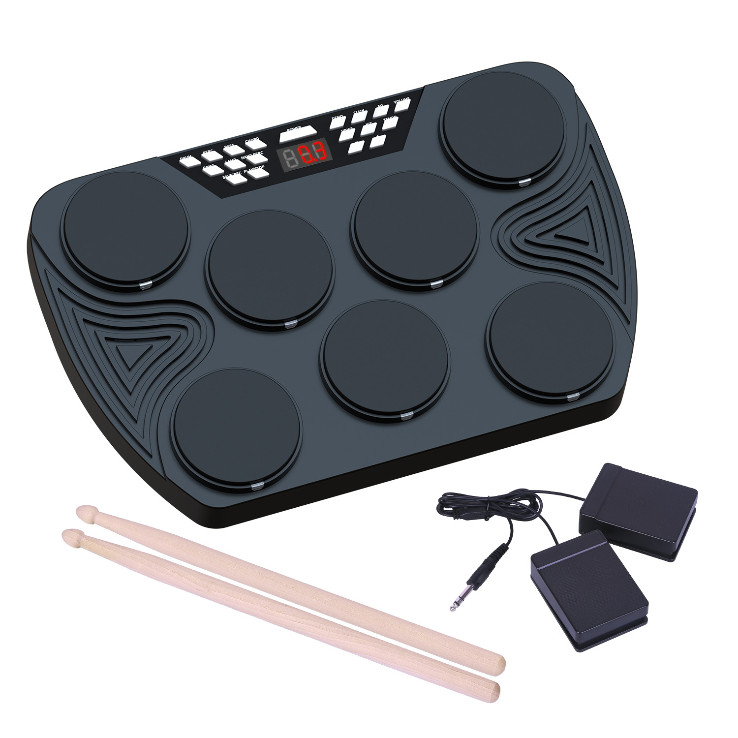 1,最多7个垫子,包括低音鼓,汤姆,圈套,hat和crash cymbal