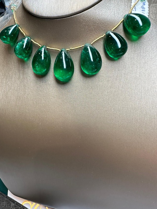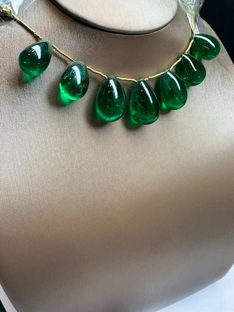 The remarkable set of perfectly matched 7 cabochon Zambian emeralds