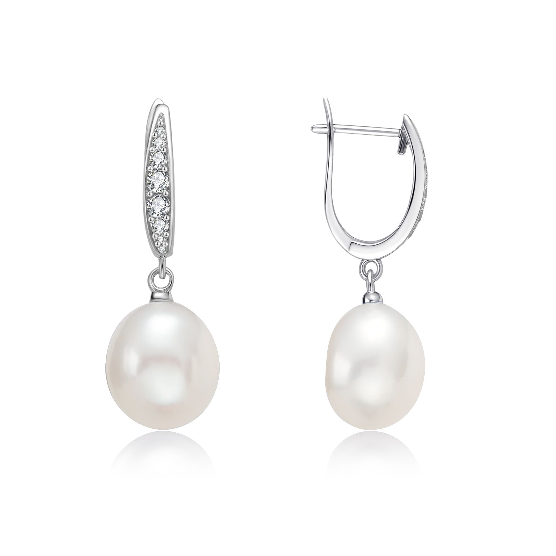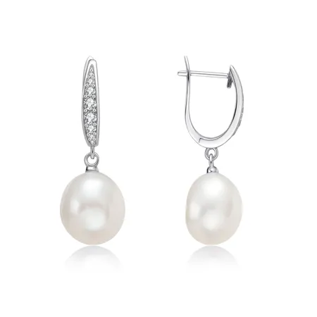STERLING SILVER EARRINGS WITH WHITE 11-12MM FRESHWATER FAT RICE PEARL AND CZ, RHODIUM PLATED