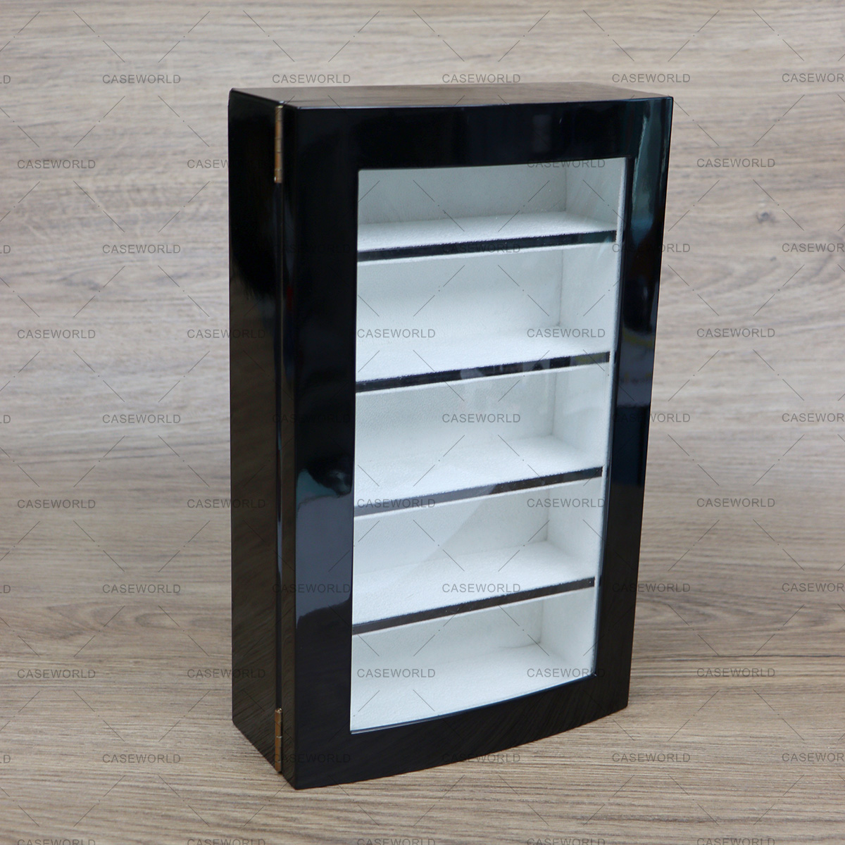 The eyewear display box boasts a sleek wood finish surface to showcase a classic look. It comes with a hinged lid . Safeguard your eyewear collection with this eyewear packaging box.