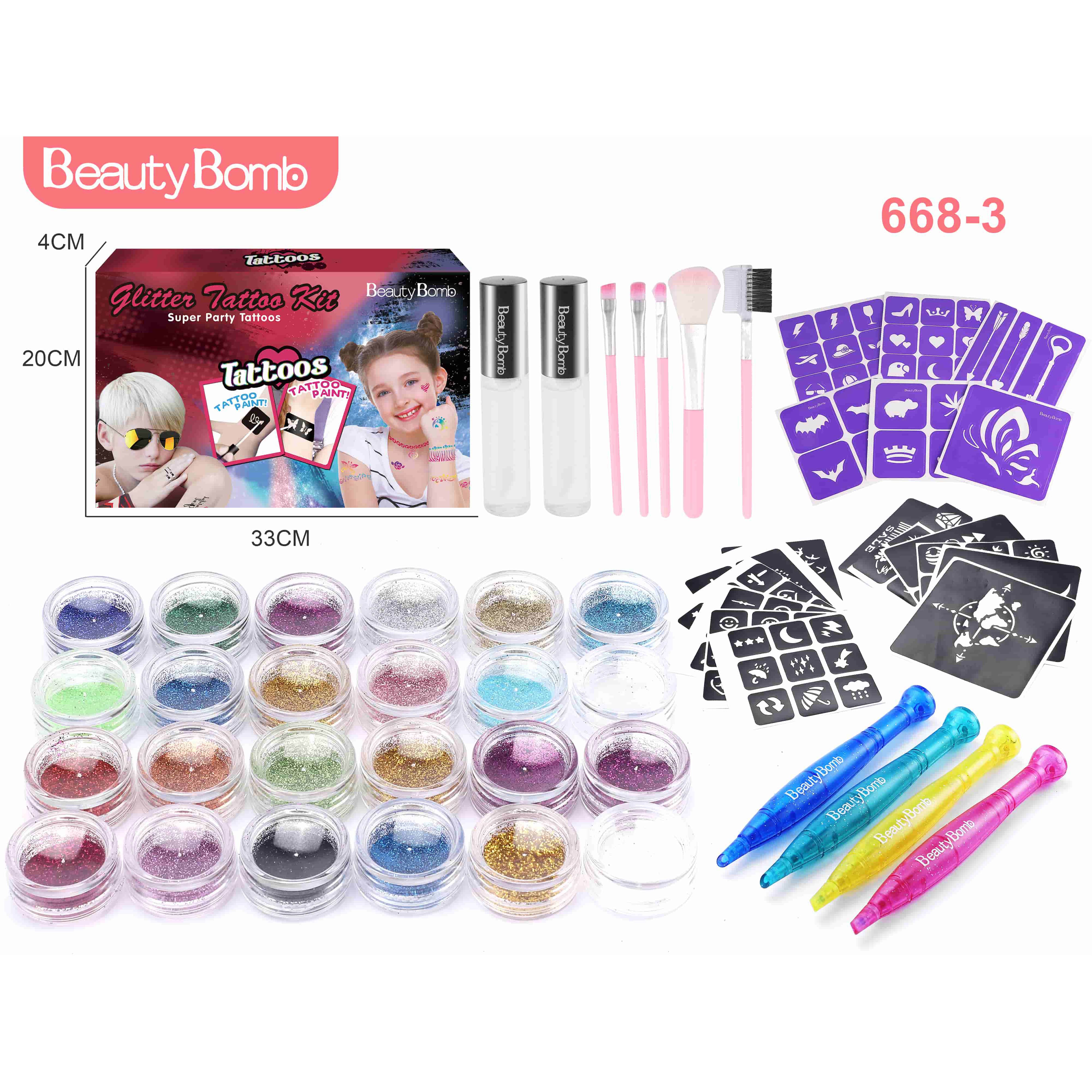 The glitter tattoo set for children contains 24 colours, 18 stencils, 2 body glue, 5 brushes. Temporary flash tattoo kits are available in a variety of patterns and colors to make you shine at parties and festivals.