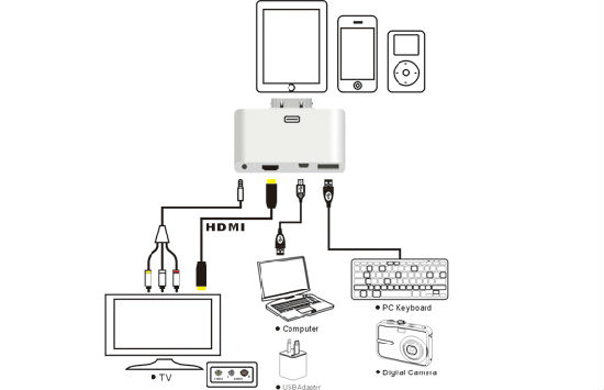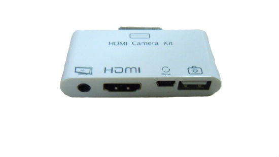 This iPad card reader features 4 useful USB ports in one kit. The USB 2.0 port directly imports your camera pictures and videos from memory card to iPad. The mini USB port is used for charging your iPad, or connecting to your computer and synchronizing with iTunes. With the AV output, pictures or videos can be viewed when in connection with TV. The HDMI port supports different audio formats and can be used for set-top boxes.