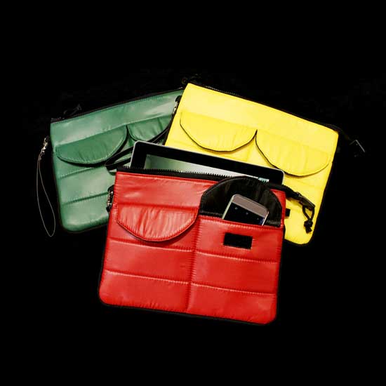 This multifunction iPad case features a main zippered compartment and two front pockets. It allows you to store your mobile phone and iPad together. The top zipper closure and hand strap complete the design of the piece.