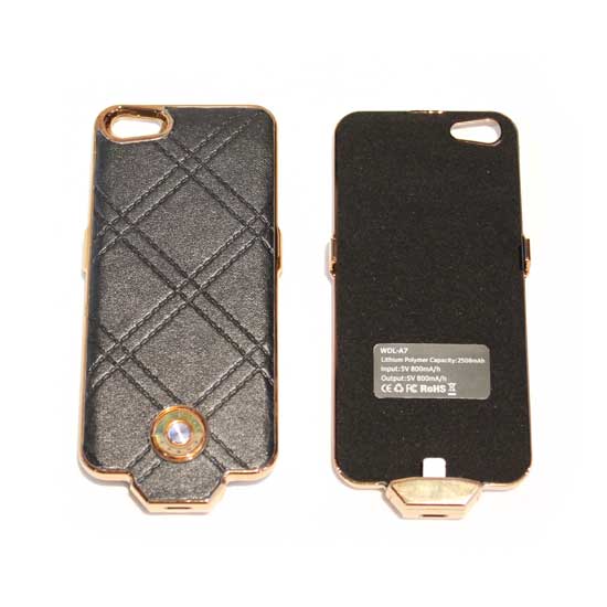 This is an iPhone battery case that is designed with a lithium polymer battery for added utility. It features a durable structure with excellent craftsmanship. The shiny golden rim highlights this case for a stylish and dainty look.