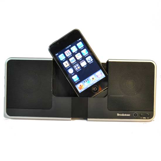 This iPod docking station comes in a portable size. The unique style features two ways for docking iPods and iPhones, vertically for music and horizontally for movies. The stereo speakers produce clear sounds.