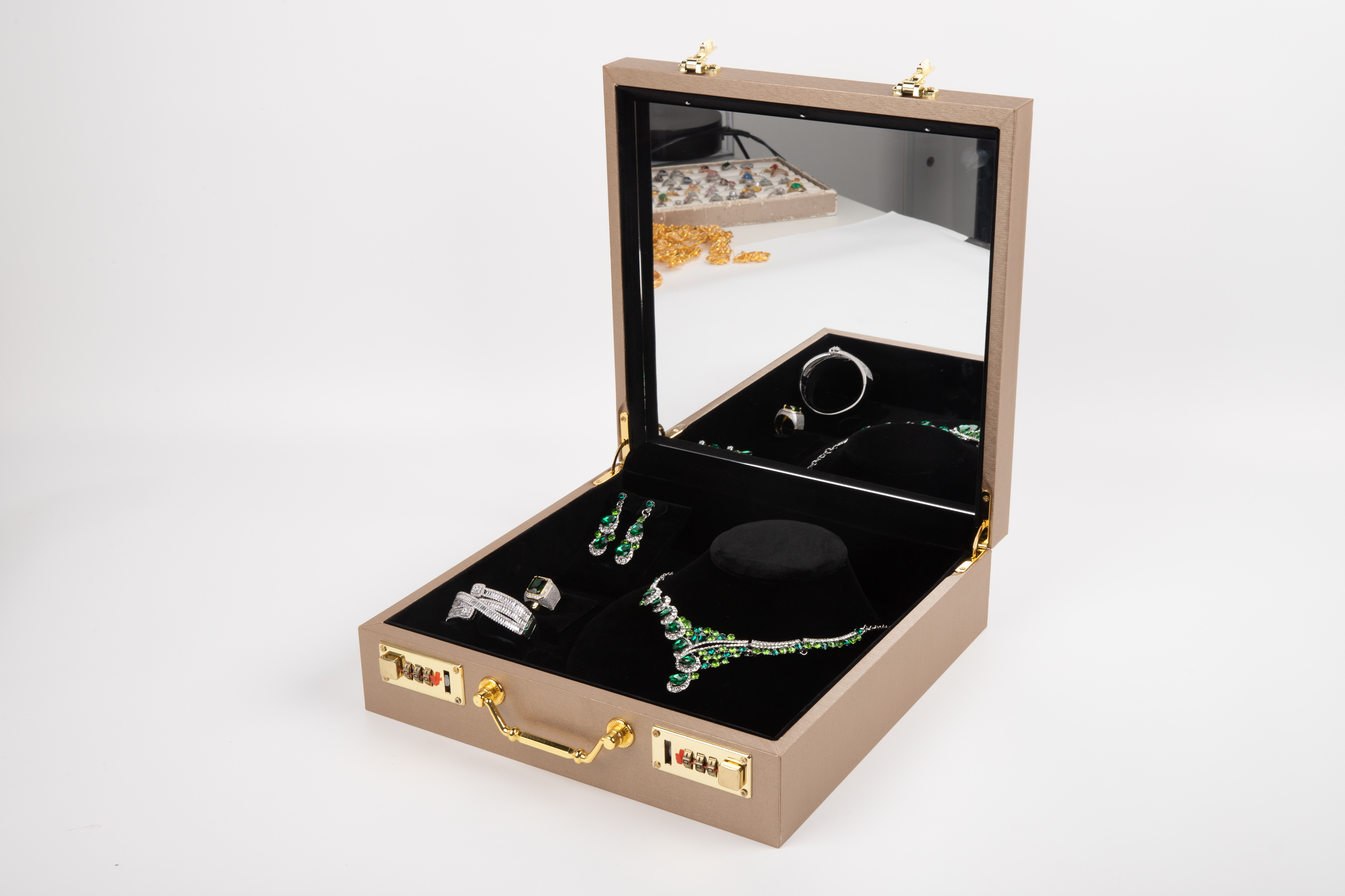 A password-protected case designed for jewellery, offering convenient portability. Customisable materials and interior configurations are available.