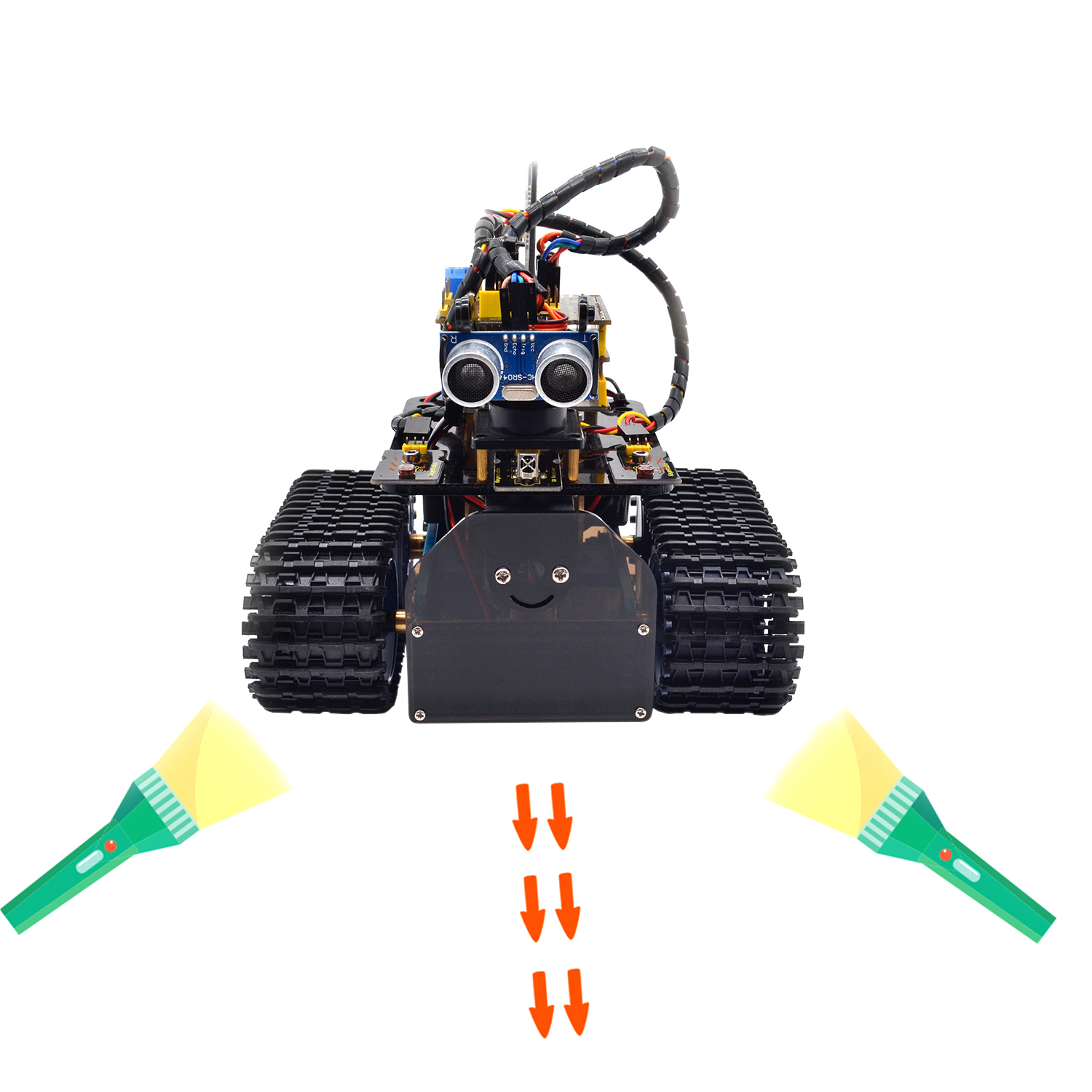 The tank robot mainly uses the UNO R3 control board, L298P driver shield and sensor shield V5, no soldering and easy to play.