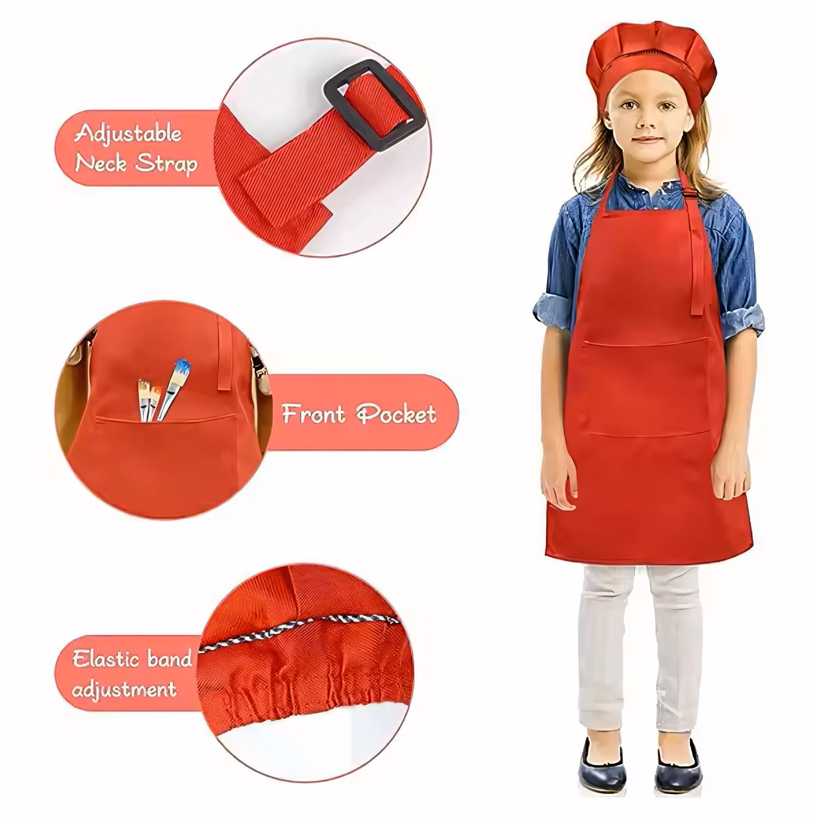 | Product Name | Kids apron and chef hat set | Style | With Pocket Design,Convenienly hold baking,cooking items,Adjustable Neck Strap,Front Pocket,Elastic band adjustment |