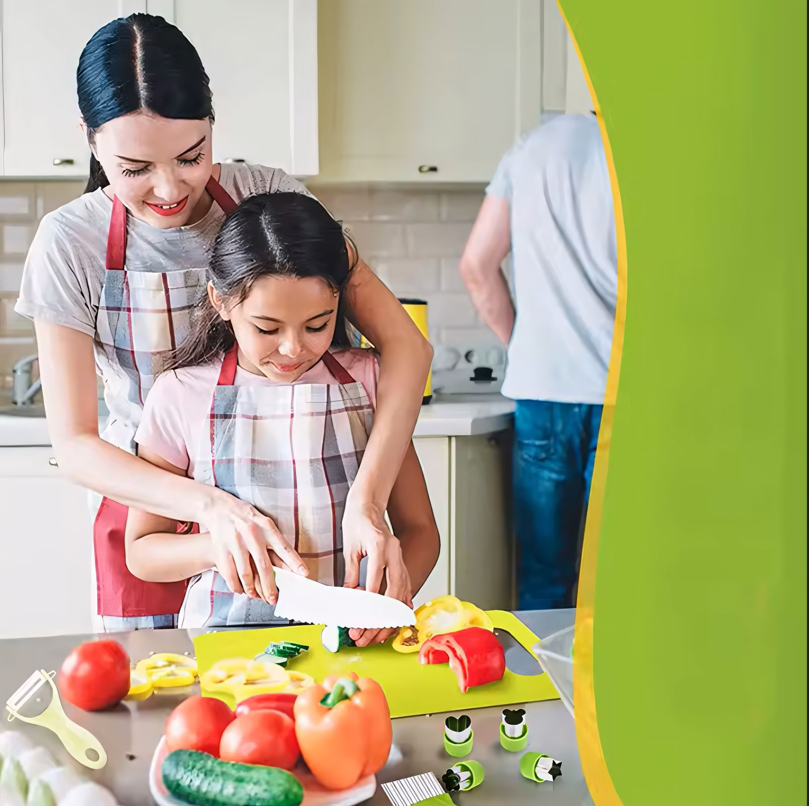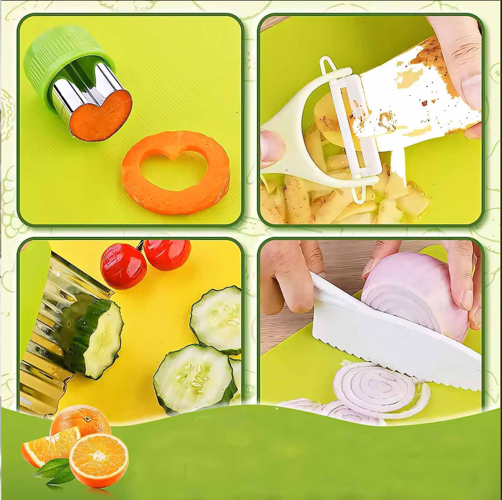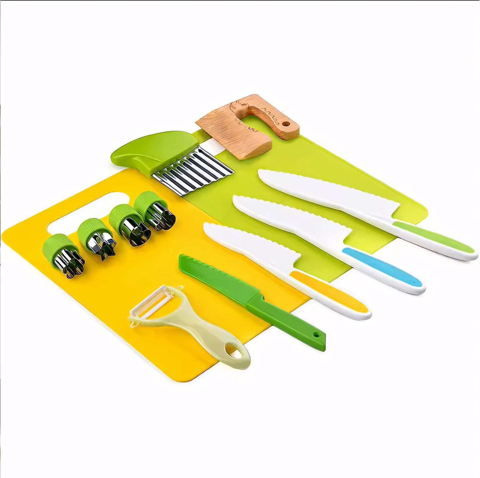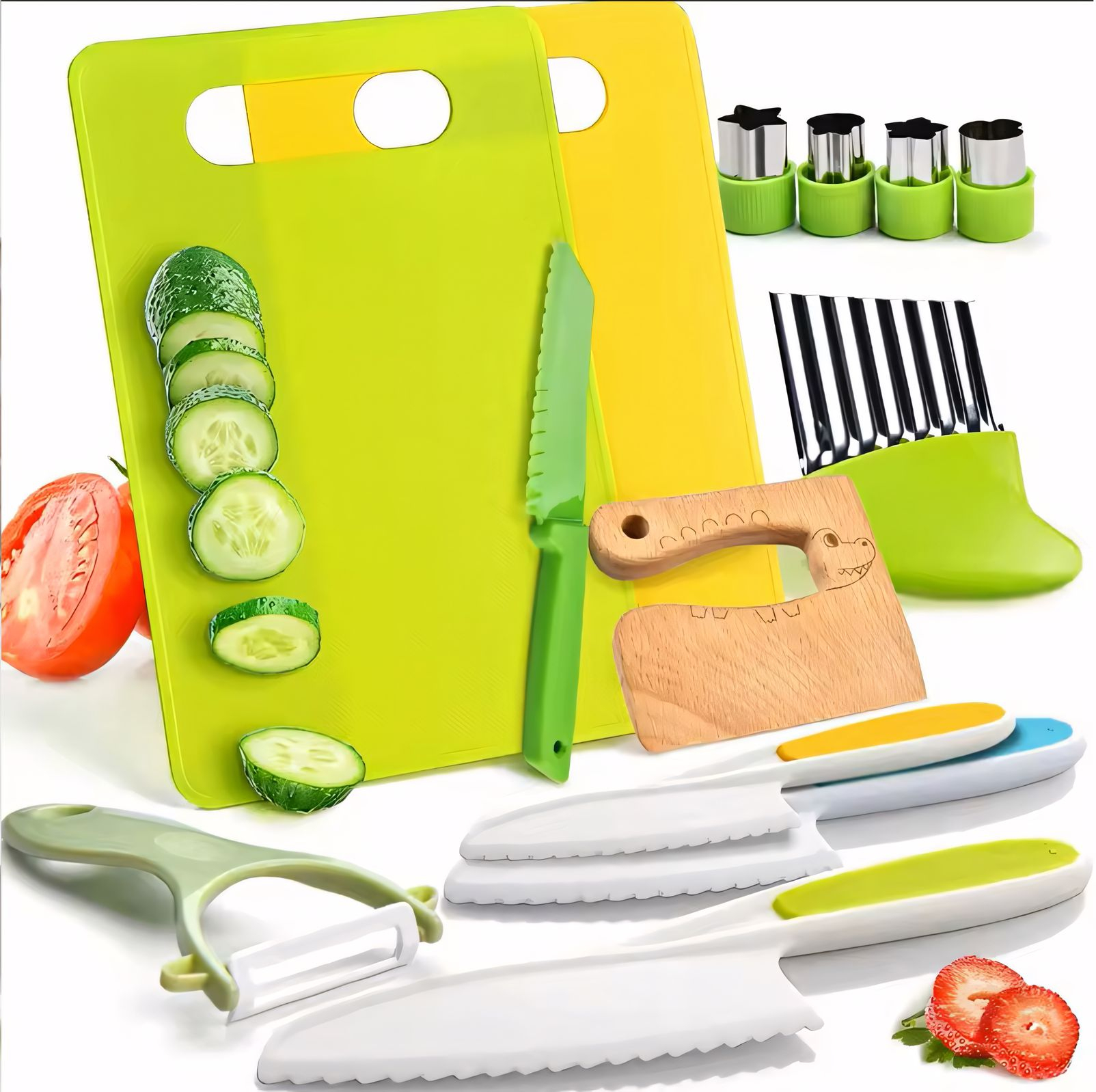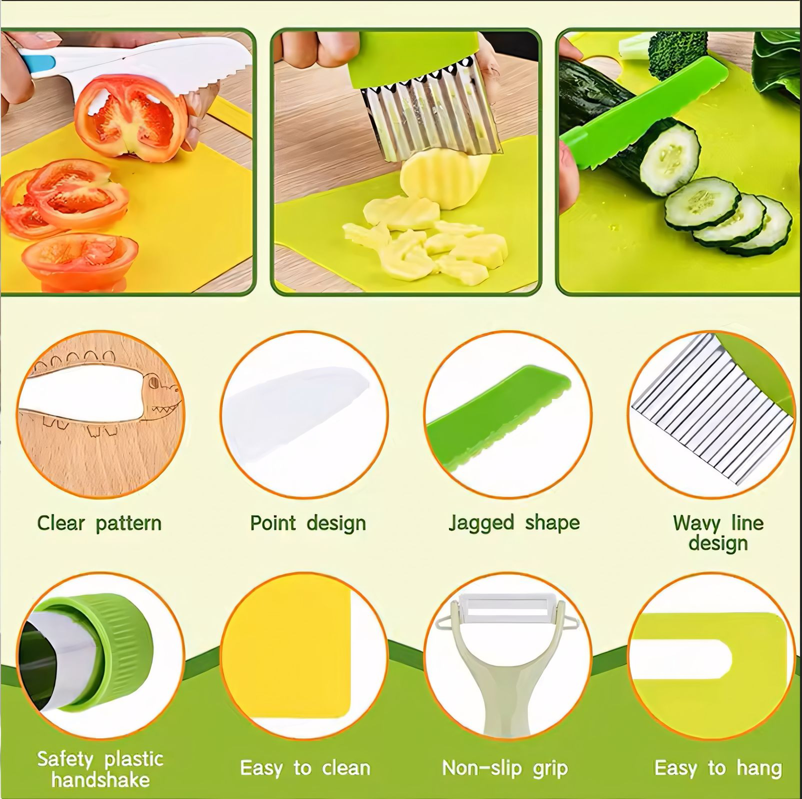 | Shapes | All Kinds of kits real cooking set 1 piece of wooden kids knife 1 piece of cooking knife 3 pieces serrated edges kids knives 1pieces cutting board 1 piece Y peeler, 4 pieces sandwich cutters 1 piece crinkle cutter | Fits For | Kitchen Knife Set for Cutting and Cooking Fruit or Vegetables Toddler Safe Knife/Crinkle Cutter/Children's Chopping Board/Y Peeler/Fruit Cutters Shapes |