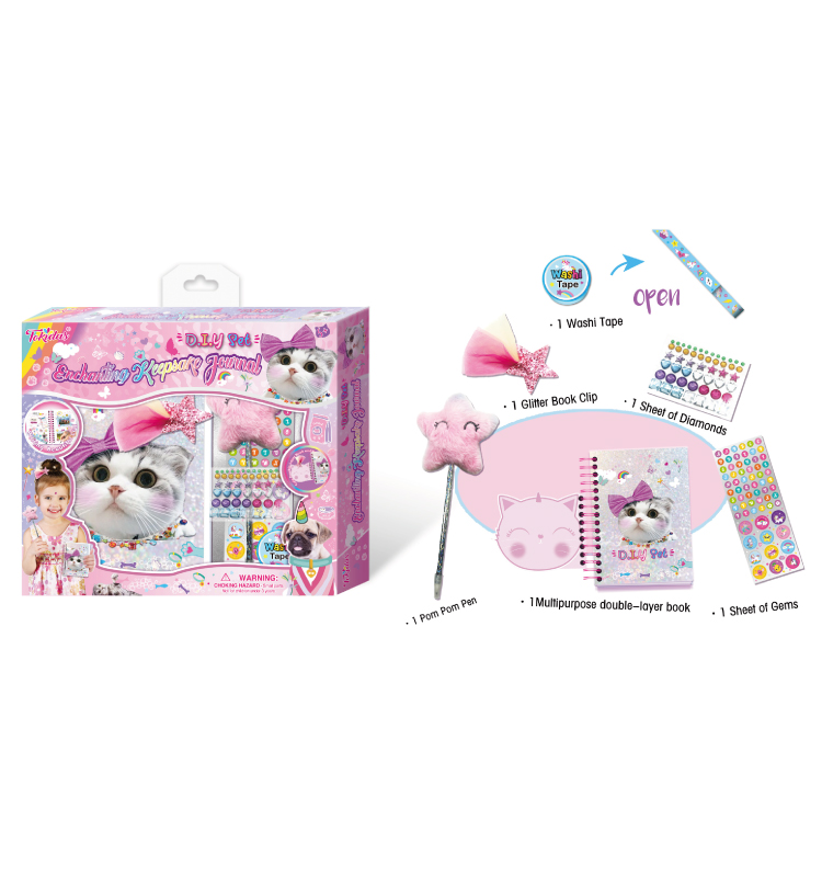 1 Double Journal Book-70Pages,1 Pom Pom Pen,1 Sheet of Gems,1 Glitter Book Clip,1 Washi Tape,1 Sheet of Decorating Stickers.