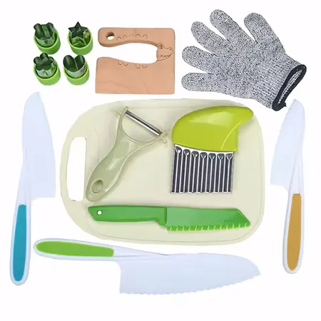 | Shapes | All Kinds of kits real cooking set 1 piece of wooden kids knife 1 piece of cooking knife 3 pieces serrated edges kids knives 1 pieces Cut Resistant Gloves 1pieces cutting board 1 piece Y peeler, 4 pieces sandwich cutters 1 piece crinkle cutter | Fits For | kids real kitchen cooking set or pretend play cooking |