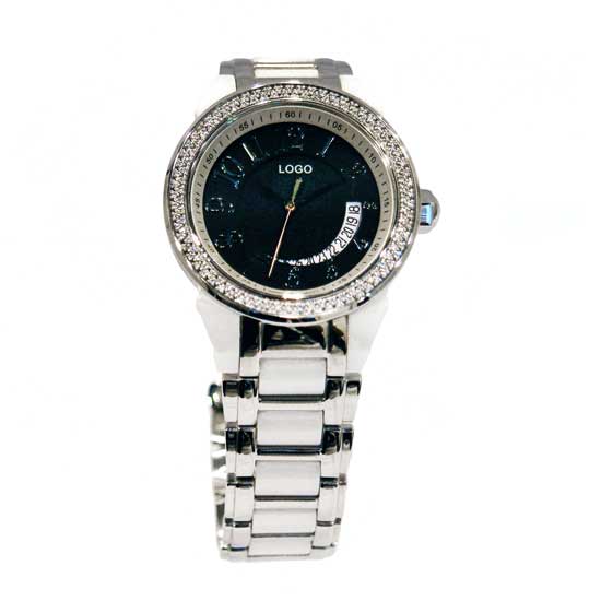 Displayed is a men's watch that comes with a cool round black dial. The date display wheel is designed in a curved tapered shape in white for a contrasting fashionable touch. The bezel is embellished with sparkling stones, which enhances the beauty of this timepiece.