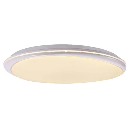 This is a round ceiling light, which is in light tones overall. There is a soft light strip around the edge of the lamp body. When lit, the light strip emits a faint glow, adding to the atmosphere. The lampshade area in the middle can emit bright and warm light. It is suitable for installation in home spaces such as living rooms and bedrooms to create a warm and comfortable lighting environment.
