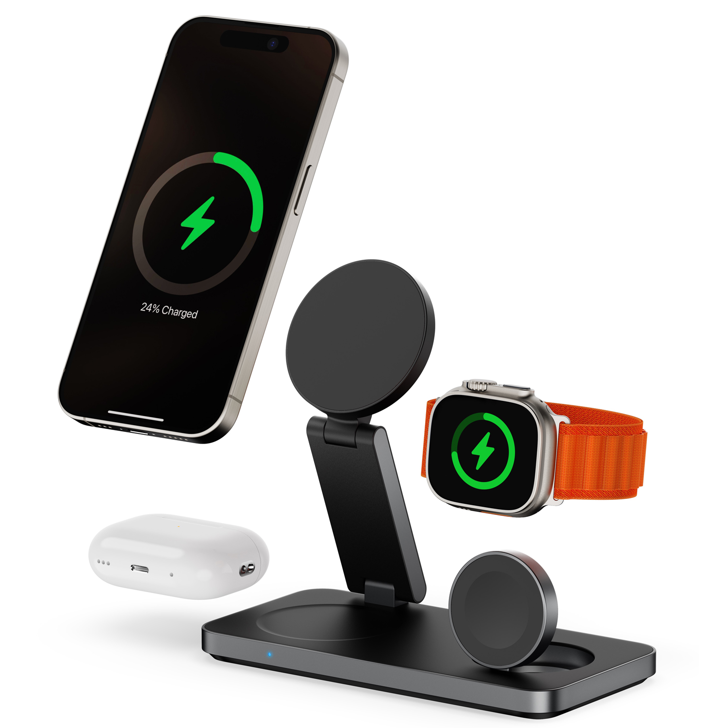Elegant foldable metal 3-in1 wireless charger in foldable design charging phone/earbuds/watch