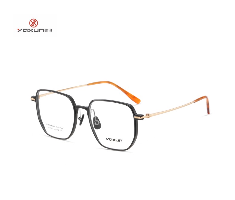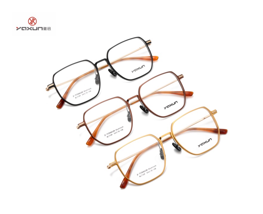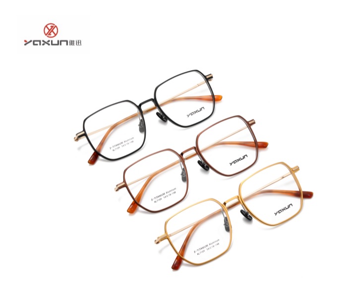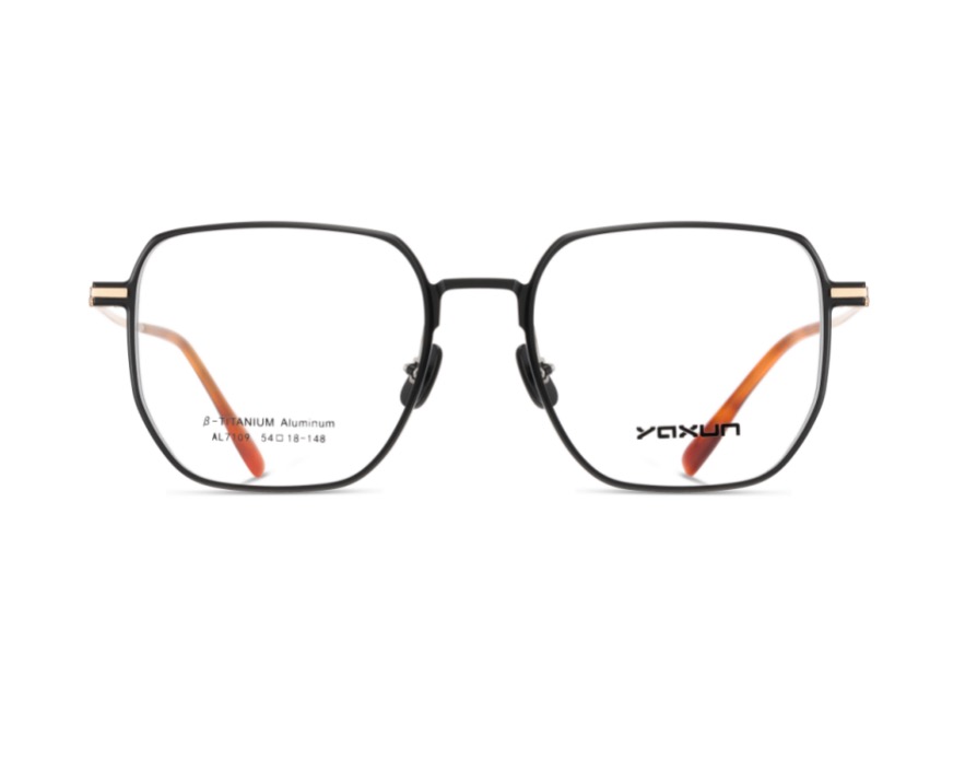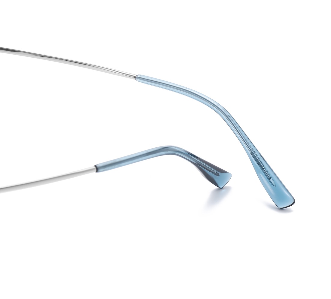 aluminium frame, b titanium temples, acetate temple tips, no screw design