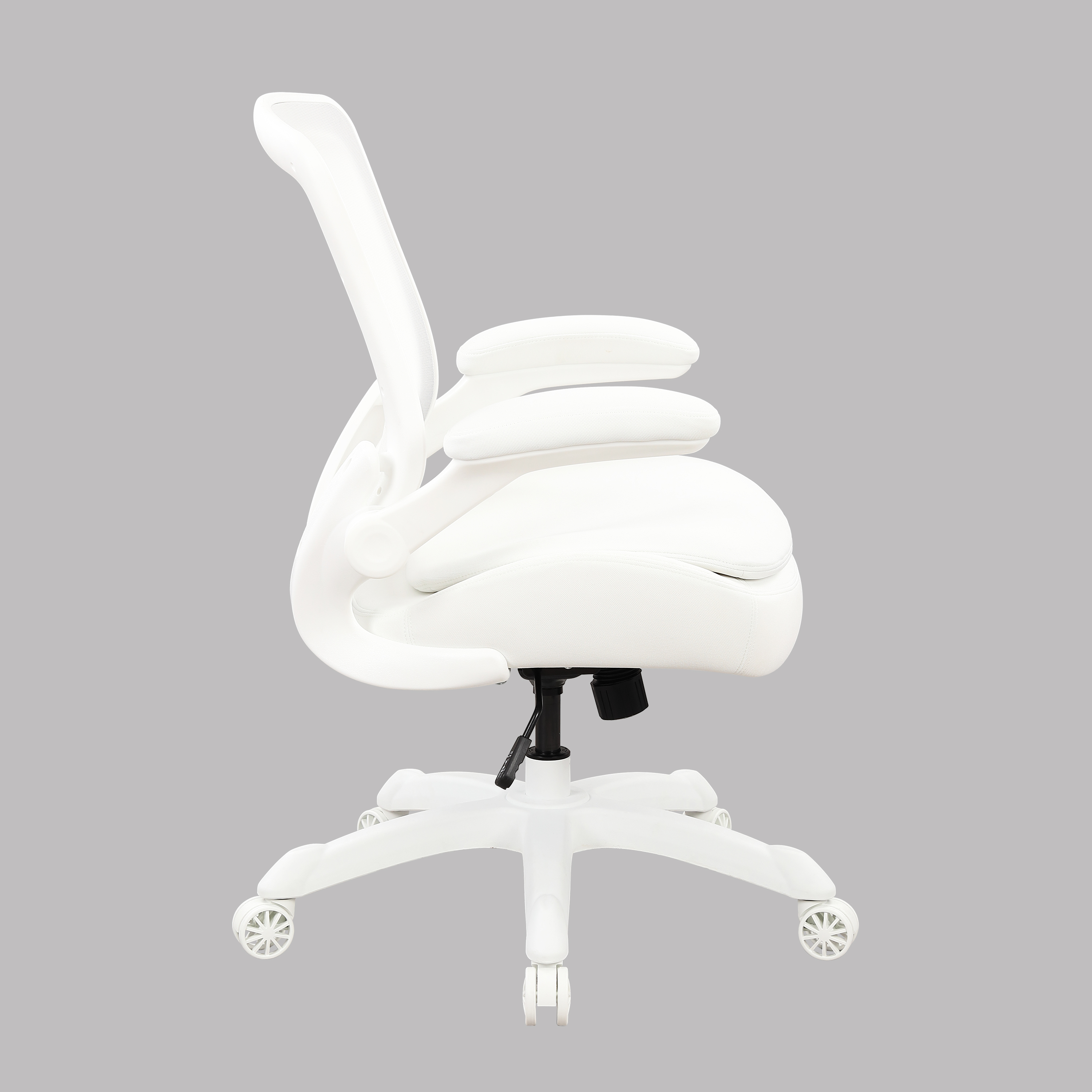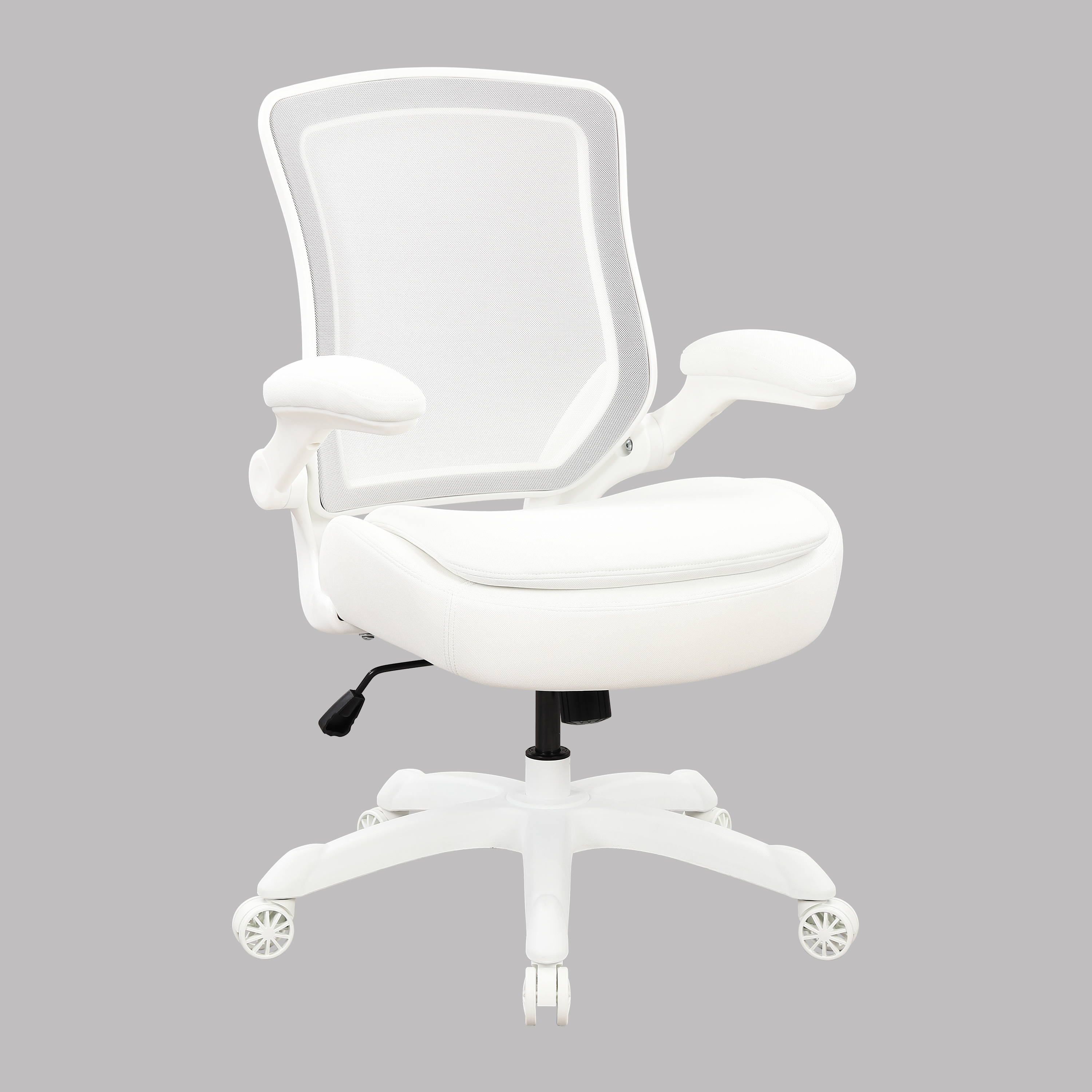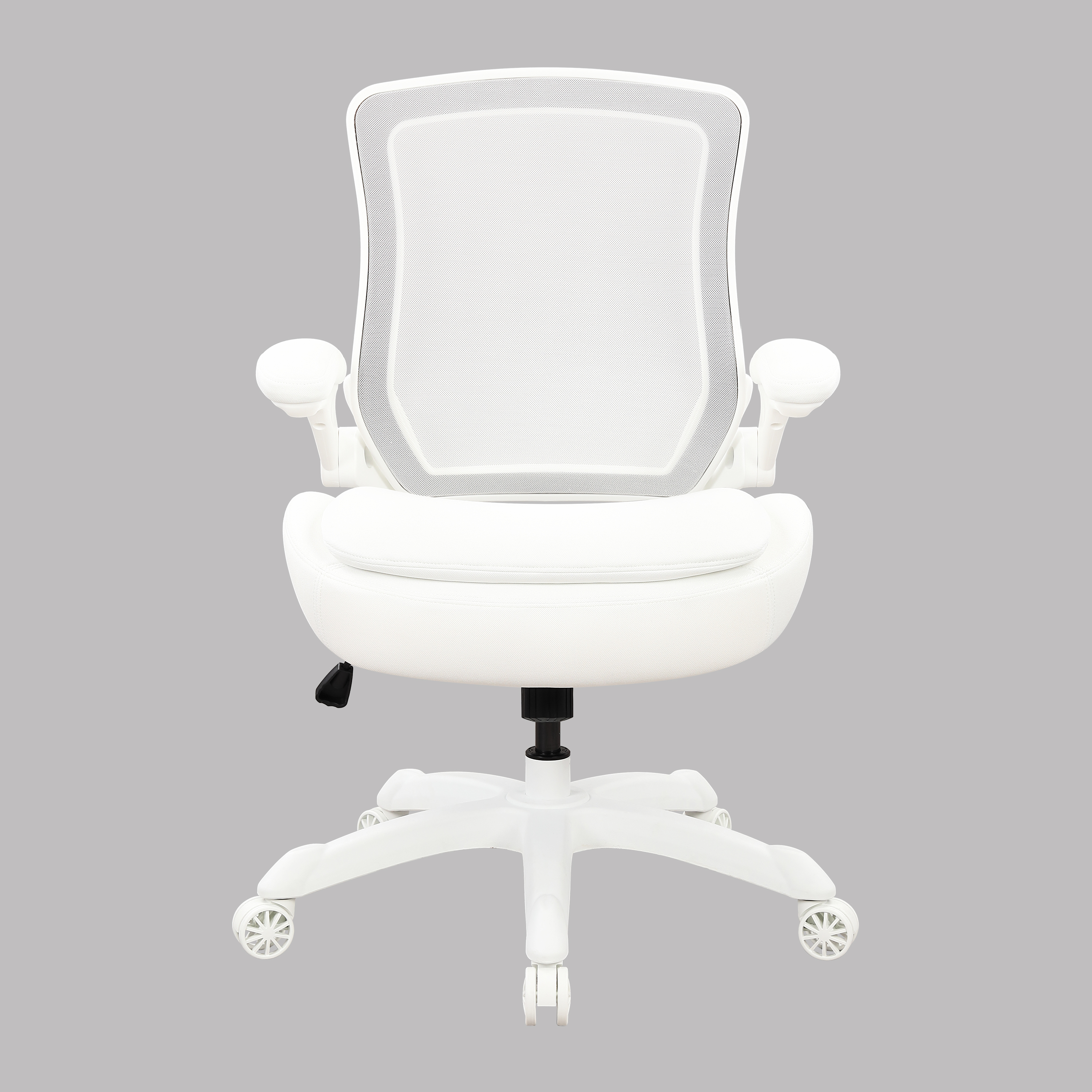 This pure white mesh fabric office chair introduction This minimalist and refreshing ergonomic chair for home and office combines comfort with functionality, making it ideal for prolonged work, study sessions, or daily use at home. Core Design Highlights Breathable mesh backrest Made of high-elastic white mesh fabric with excellent breathability, it prevents sweating during prolonged sitting and is particularly suitable for summer use. The ergonomic S-shaped curve backrest naturally conforms to the back, dispersing pressure on the upper body and alleviating fatigue from prolonged sitting. Thick and comfortable seat cushion High-density sponge filling with skin-friendly breathable fabric ensures soft and enveloping seating comfort, resisting collapse during prolonged sitting. The curvature design conforms to the physiological curve of the buttocks, effectively dispersing sciatic pressure and enhancing comfort during prolonged sitting. Adjustable flip armrest The soft-pack armrest features a comfortable tactile surface that provides effective arm support and reduces shoulder strain. Supports height adjustment and flip function. Fold up when not in use to save desktop space and make it easy to access. Practical adjustment function Seat height adjustment: The pneumatic rod can be raised or lowered via the left-side lever to quickly accommodate different heights, ensuring stable foot placement. 360° free rotation: Paired with a nylon five-star tripod, it ensures smooth turning for effortless movement within office spaces. Noiseless omnidirectional roller: Equipped with a silent roller at the base, it operates with minimal noise during movement and prevents floor scratches. Rearward Locking (Available in Some Models): Certain models feature a reclining backrest with adjustable locking angles, providing comfort for short naps or back relaxation. Appearance and Material Color scheme: The all-white design exudes clean and refreshing aesthetics, seamlessly complementing modern minimalist and Scandinavian-style home and office environments. Frame: Made of high-strength nylon material, lightweight with strong load-bearing capacity and structurally stable and durable. Safety: Certified with air pressure rod safety standards for enhanced user confidence. applicable scene Office daily tasks Study at Home in the Study Room / Esports Children's Room Student Learning Chair Compact space (reversible armrests for better space utilization)