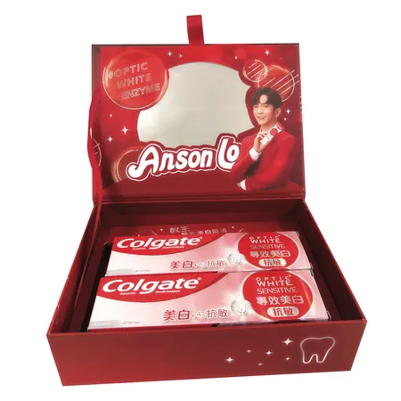The box is made by 157g gloss paper with matt lamination mounting with 1.5mm chipboard, the inner tray where holding the tooth boxes. Four printing with matt lamination and spot UV coating on front panel of box. Rigid box making with flipping cover and attaching one piece ribbon at front edge of cover, adding one mirror inside box.
