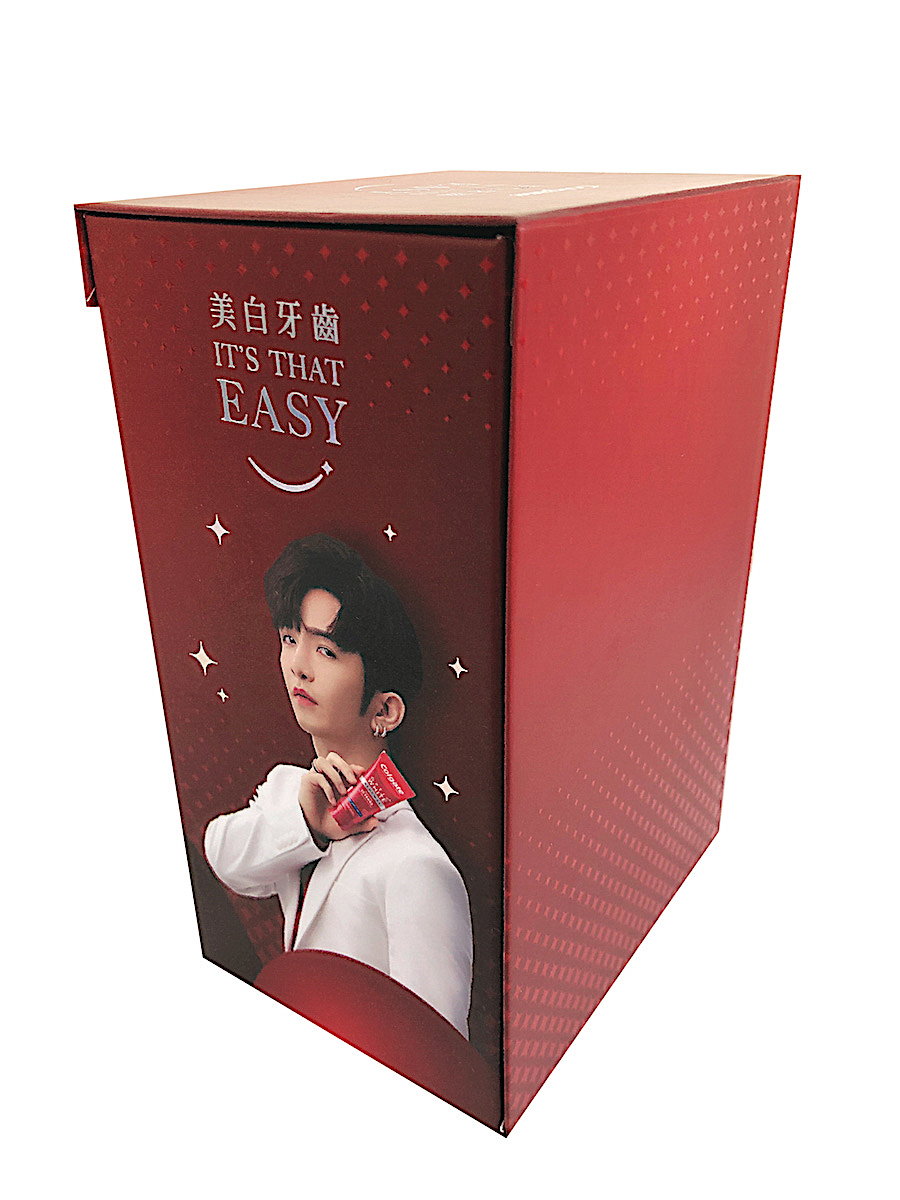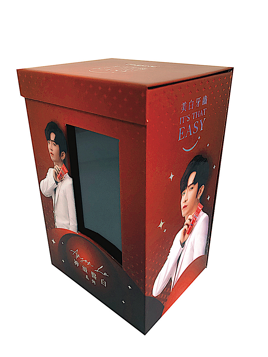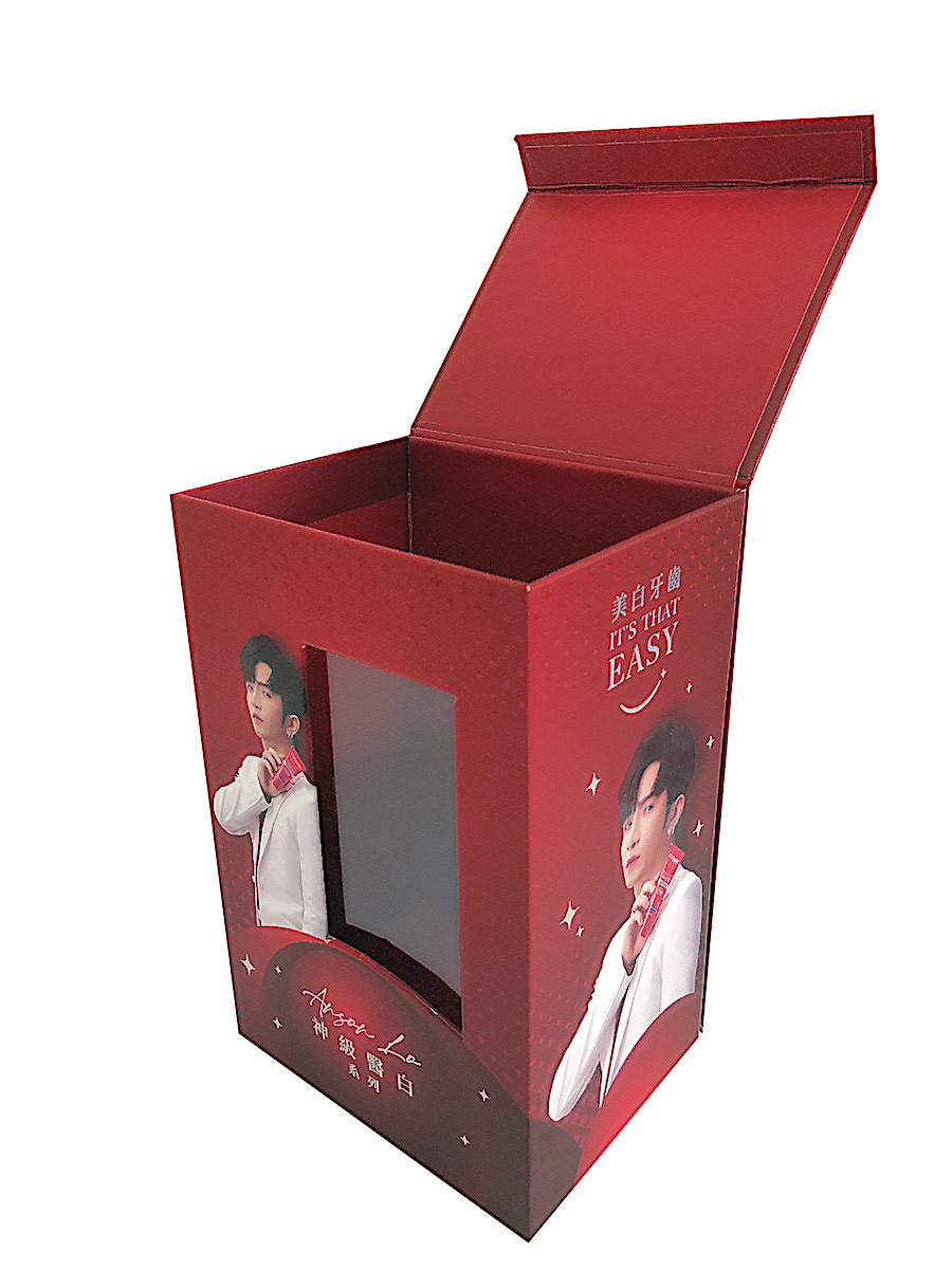 The box is made by 157 gloss paper mounting with 1.5mm chipboard, four colours printing with matt lamination and spot U.V. and holographic hot stamping, opening an acetate window on front panel showing the packed product. The acetate window is also acting as photo frame.