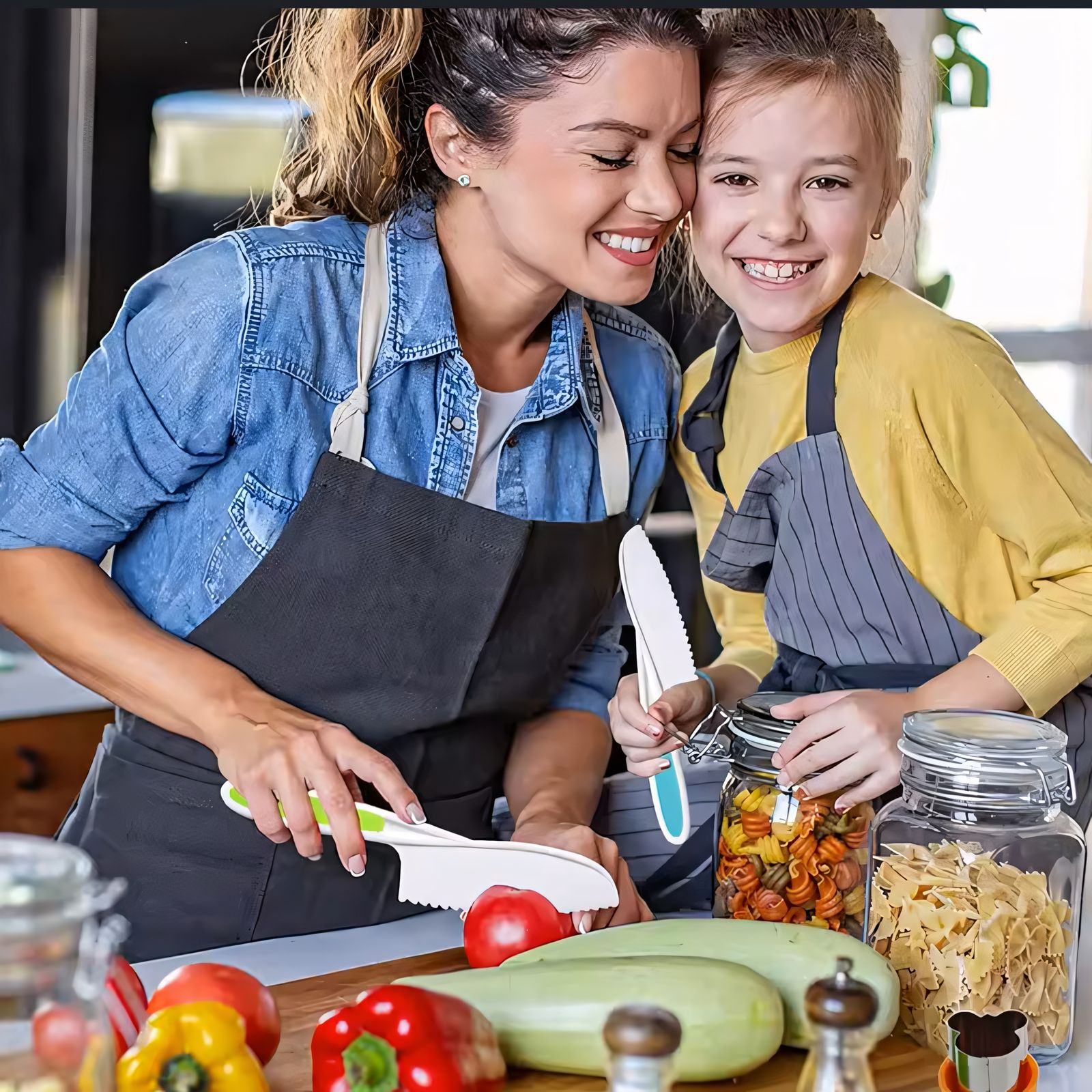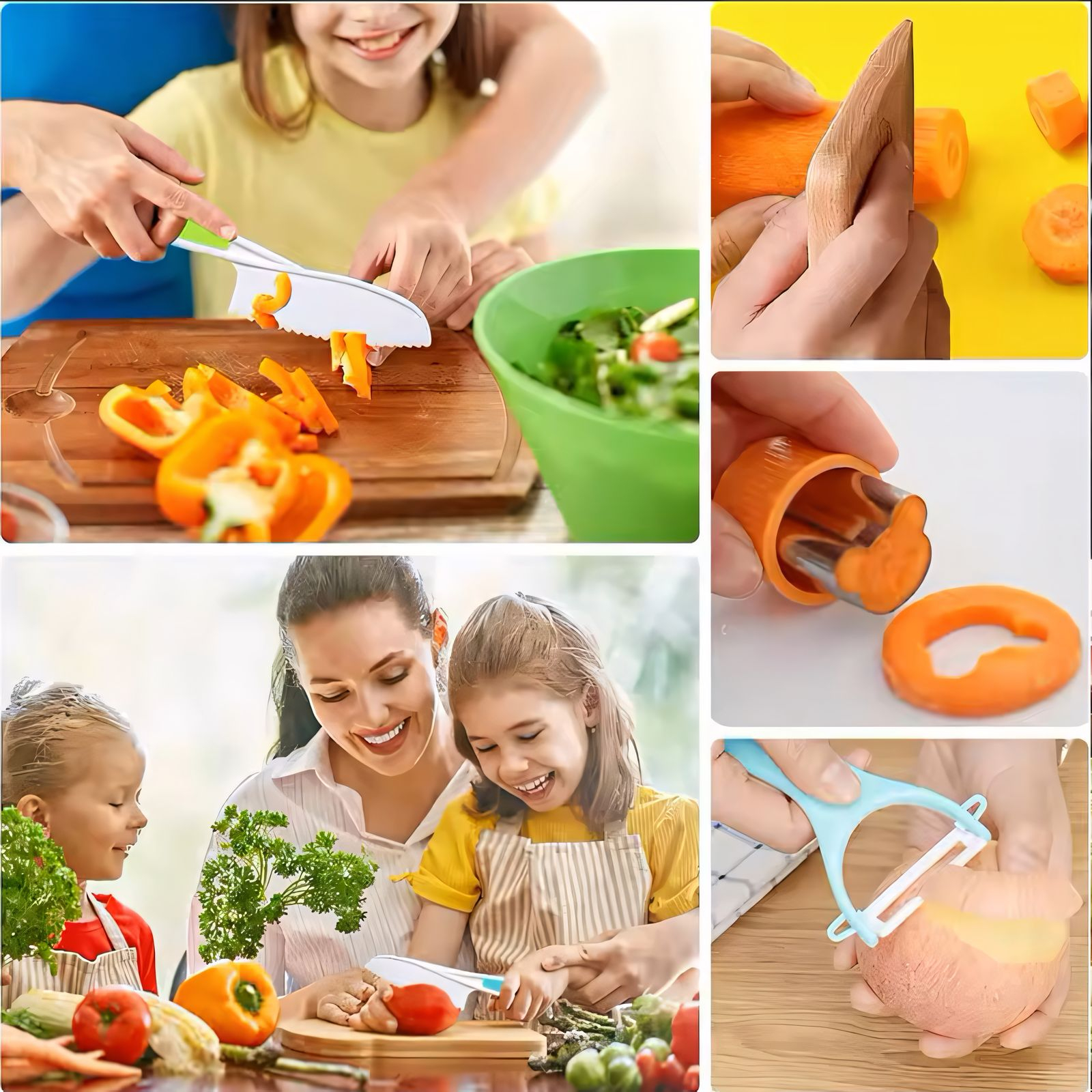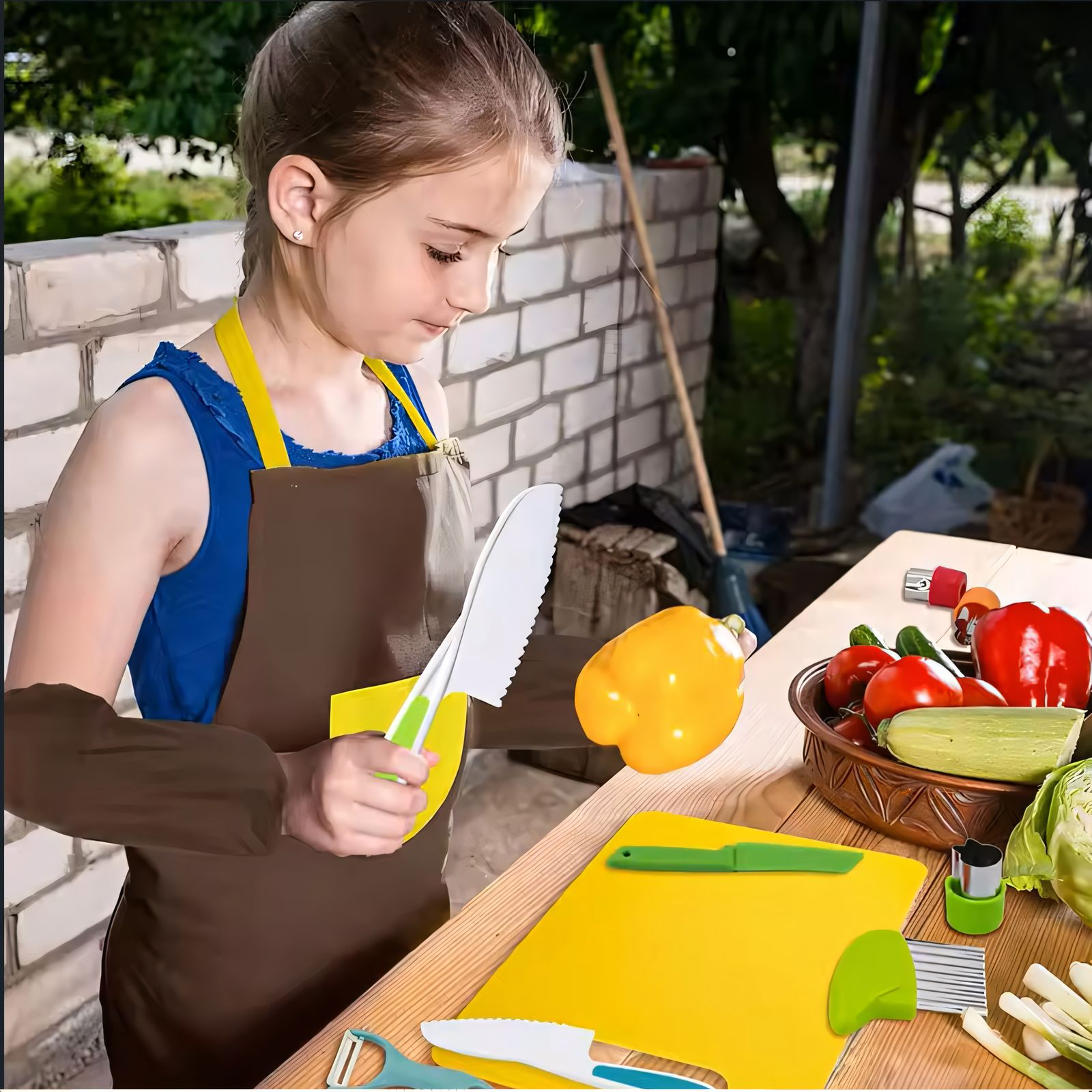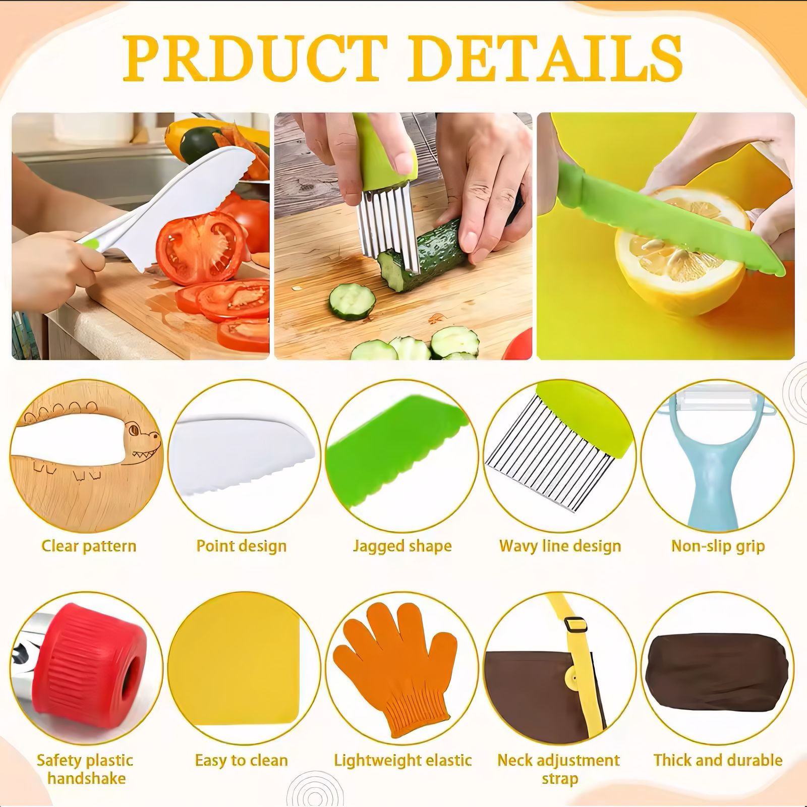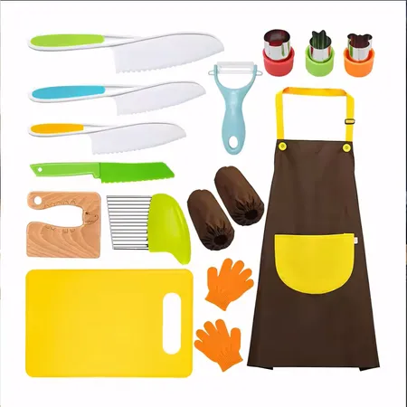 | Shapes | All Kinds of kits real cooking set 1 piece of kids wooden knife, 1 piece of cooking knife, 3 pieces serrated edges toddler knives, 1 piece cutting board, 1 piece of apron, 1 piece of kitchen sleeves covers, 1 pair of resistant gloves, 1 piece Y peeler, 3 pieces sandwich cutters, 1 piece crinkle cutter | Fits For | a variety of styles and uses of toddler kitchen tools can meet the needs of kids usage requirements. The kids knife for real cooking is made of wood and high-quality food grade polypropylene, the knife which cuts potatoes is made of quality stainless steel. These kids knives are non-toxic, BPA-free materials, safe to use, not easy to break and deform, kids kitchen knives with waterproof and oilproof apron will bring you a good user experience. |