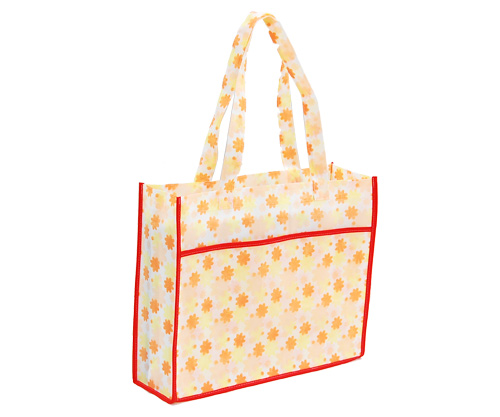The featured non-woven bag is specially designed for young ladies in no doubt. The beige-colored body is imprinted with little flowers in a single pastel color. The red trims style up the whole design further.
