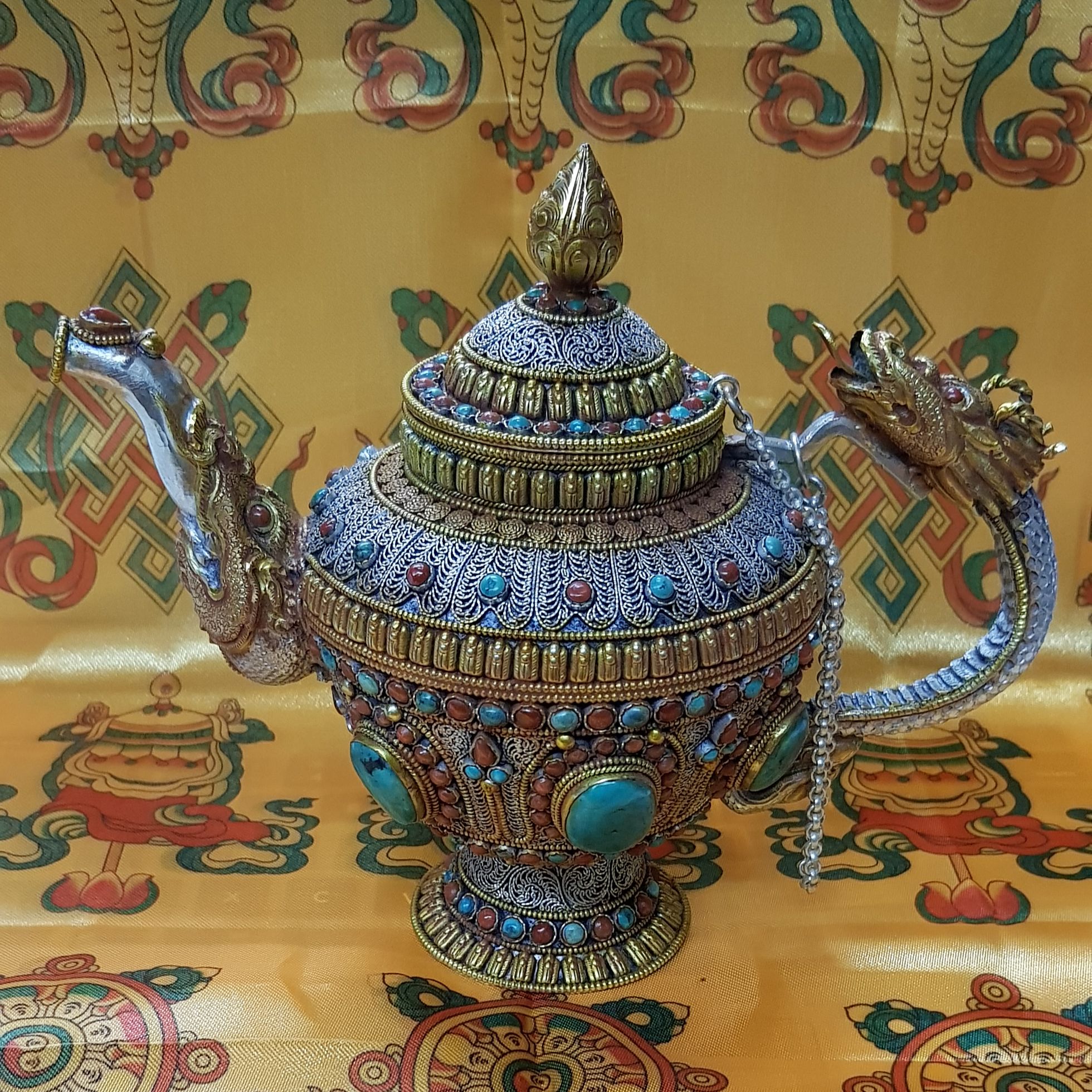 Beautifully carved filigree work teapot. handmade in Nepal with original Turquoise and coral stones . it is one of a kind antique to decorate home and office. collectable item