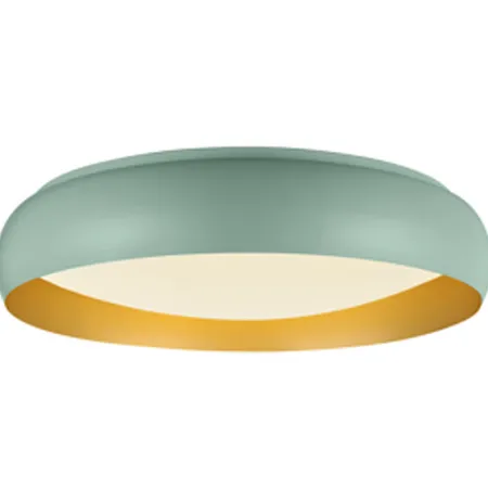 This is a round ceiling light. The upper lampshade is light green, and the bottom features a warm - brown frame with wood grain texture. With a round shape, it emits soft and comfortable light when lit.
