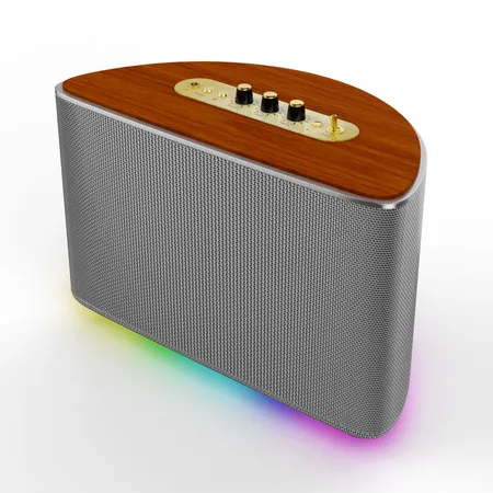 The new Bluetoooth speaker has a sleek design, that is a combination of wood and aluminum alloy elements, and it even has a built-in LED display colors. It’s not just a speaker—it”s a statement piece, fits perfectly in any modern home or office, it delivers crystal-clear, powerful sound with deep bass, you can rotate the swatch from 0-10 to change the bass and treble level, perfect for any music lover. Plus, it has four sources to connect devices: RAC,AUX,Bluetooth,OTP.