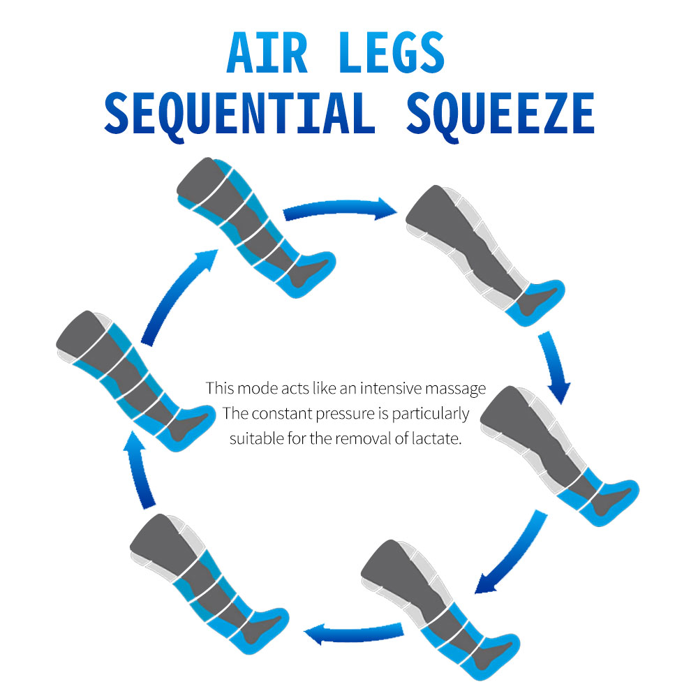 Air chambers and air pumps are used to produce air compression massage for the legs and waist. Through the repeated sequential and intermittent inflation and deflation of the air chambers, air compression therapy is effective in promoting good blood and lymph circulation, improving metabolism and expanding blood vessels in the body. IPC therapy as a physical therapy method which is widely adopted by physiotherapist to make treatment for lymph edema relief, poor blood circulation, sports recovery, limb paralysis and limb pain relief.