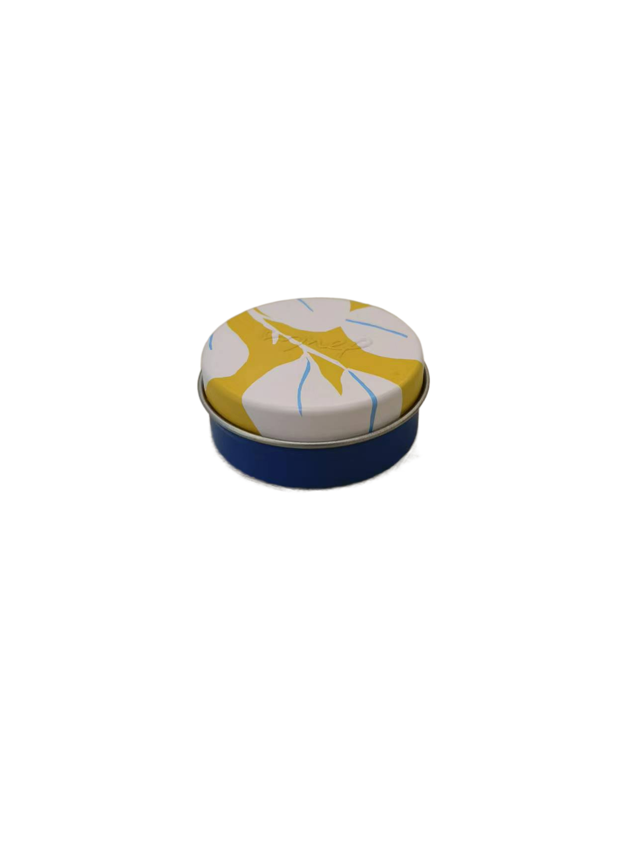 Appearance: Compact flat cylindrical shape with a snug-fitting lid; the can body is deep blue, while the lid features a white base with bold yellow leaf patterns and delicate blue vein lines, creating a fresh and artistic look.