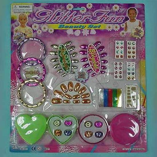 This is a toy jewellery set that has a combination of accessories included. Most of them are made of plastic and sticker paper, their surface look bright and shinny. Also, 2 ring cases are provided.