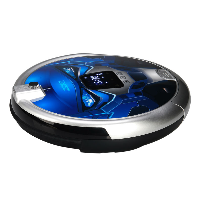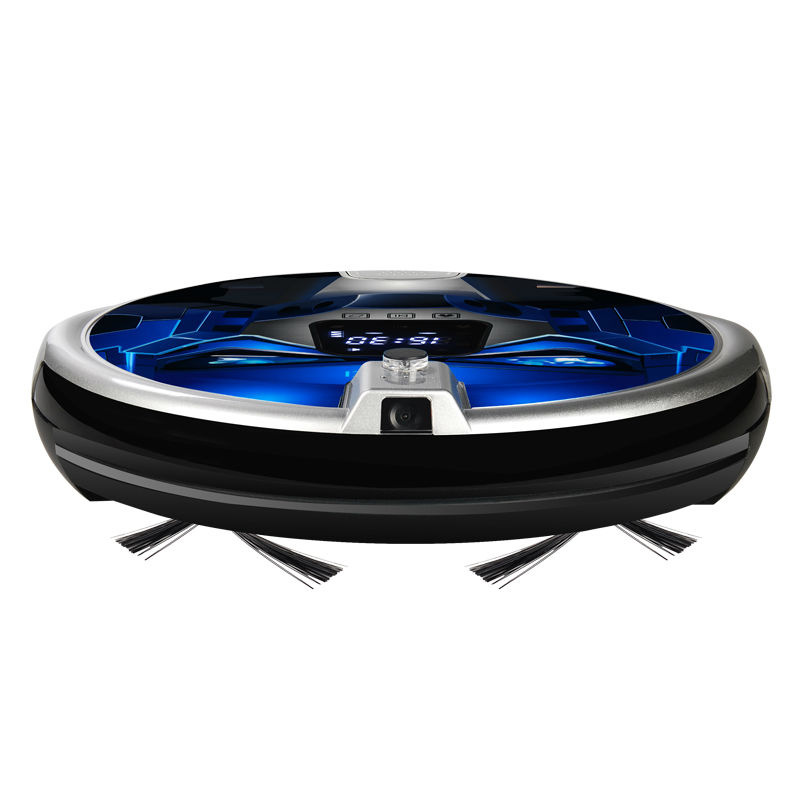 Displayed here is an advanced and smart robotic vacuum cleaner of versatile use. With functions such as the anti-scratch system and auto-recharging, it can simultaneously mop and sweep on different floors. Showing a sturdy, circular structure with intimate flatness, this one effectively cleans your house while you are away.