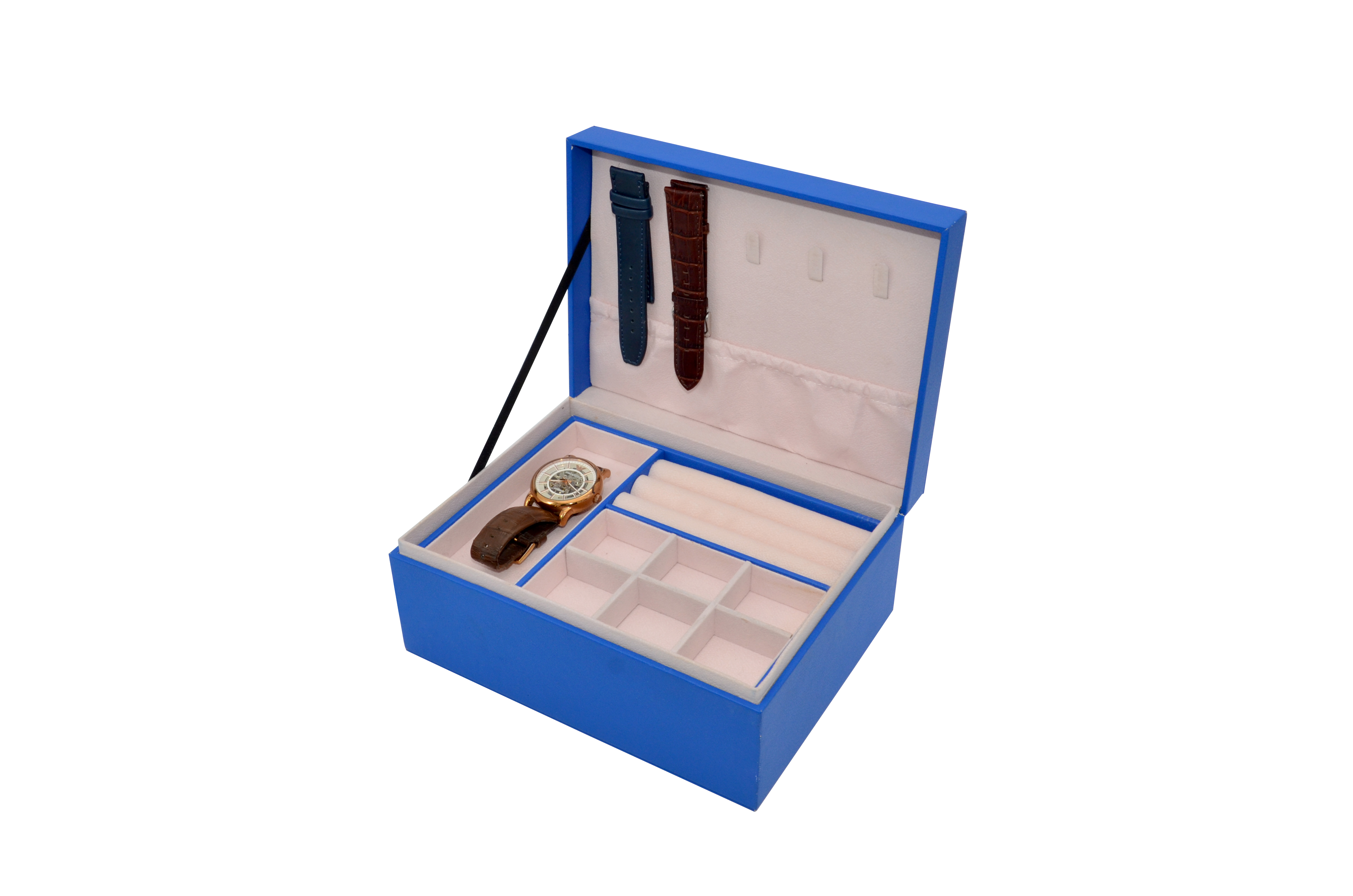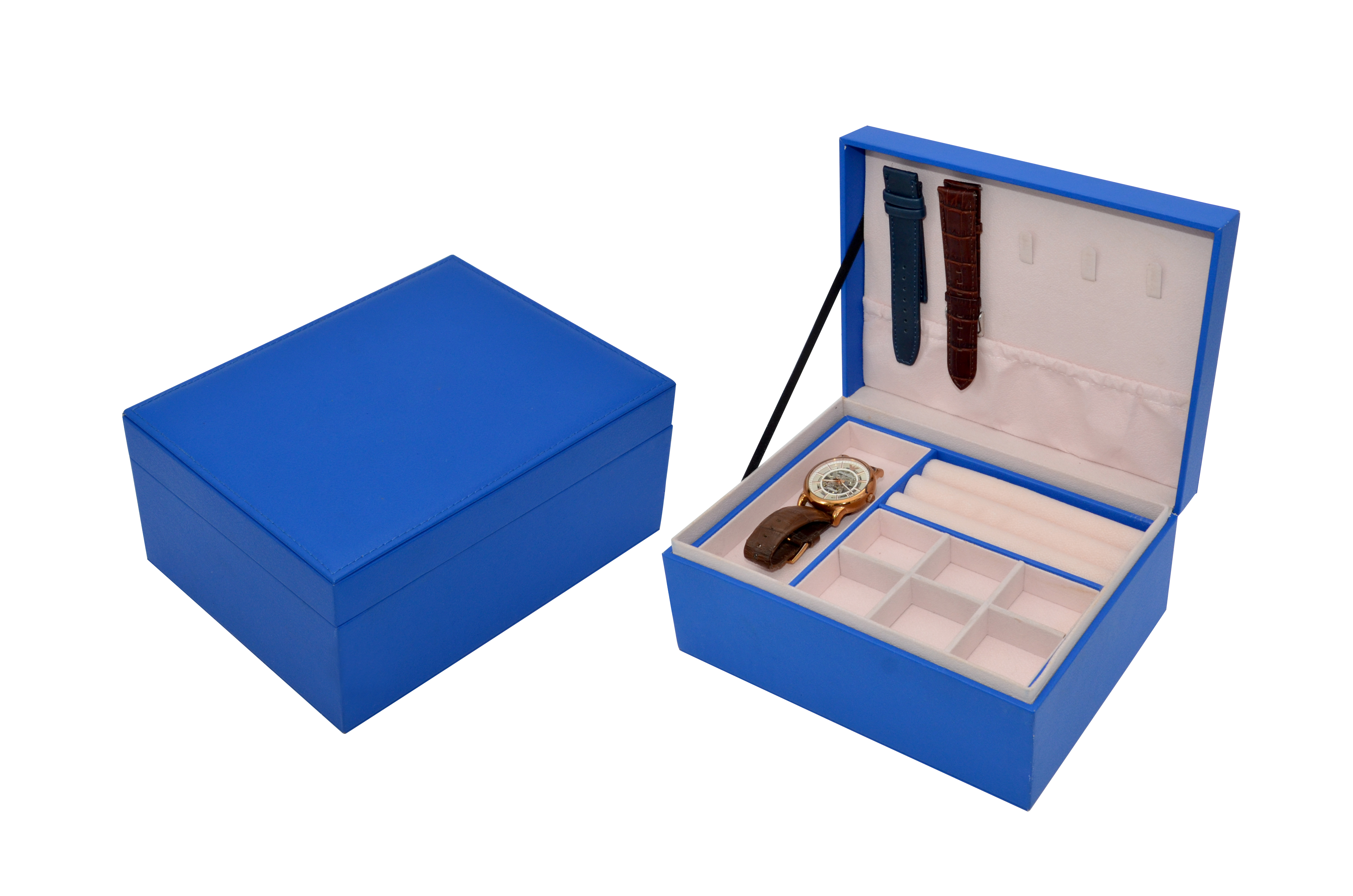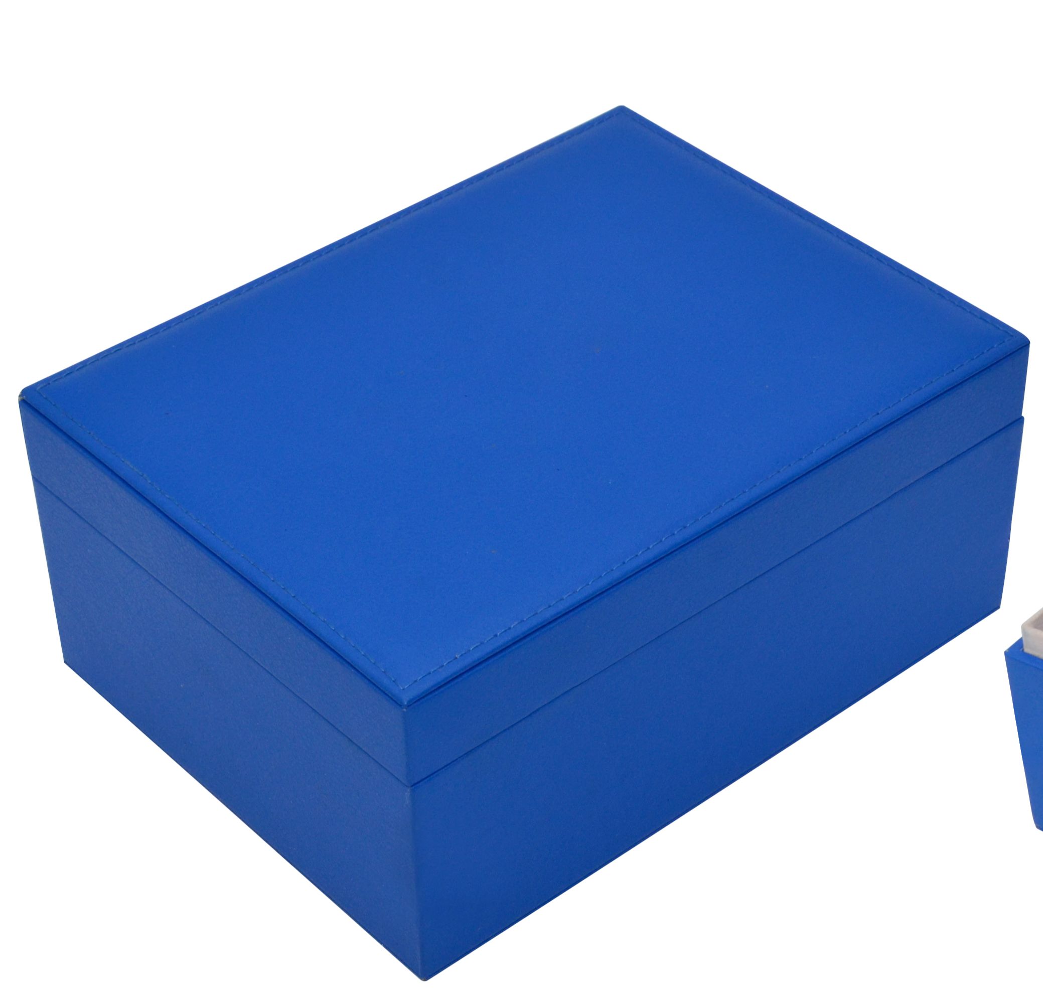 This Blue Wooden Box Watch Box uses dark blue as its main colour to convey an atmosphere of style and calm. Dark blue colour symbolises wisdom, authority and nobility, which can give people a dignified and striking feeling. The design of the whole box matches the technological attributes of the smartwatch, which can better increase the sense of quality and brand image of the product. The dimensions of the watch box are 22X17X9CM, which is made of medium fibre board covered with PU material, and the interior is made of MDF material and velvet as the inner material, providing the dual functions of elegance and protection. With a MOQ of 1000 pieces, this watch box is suitable for bulk purchase.