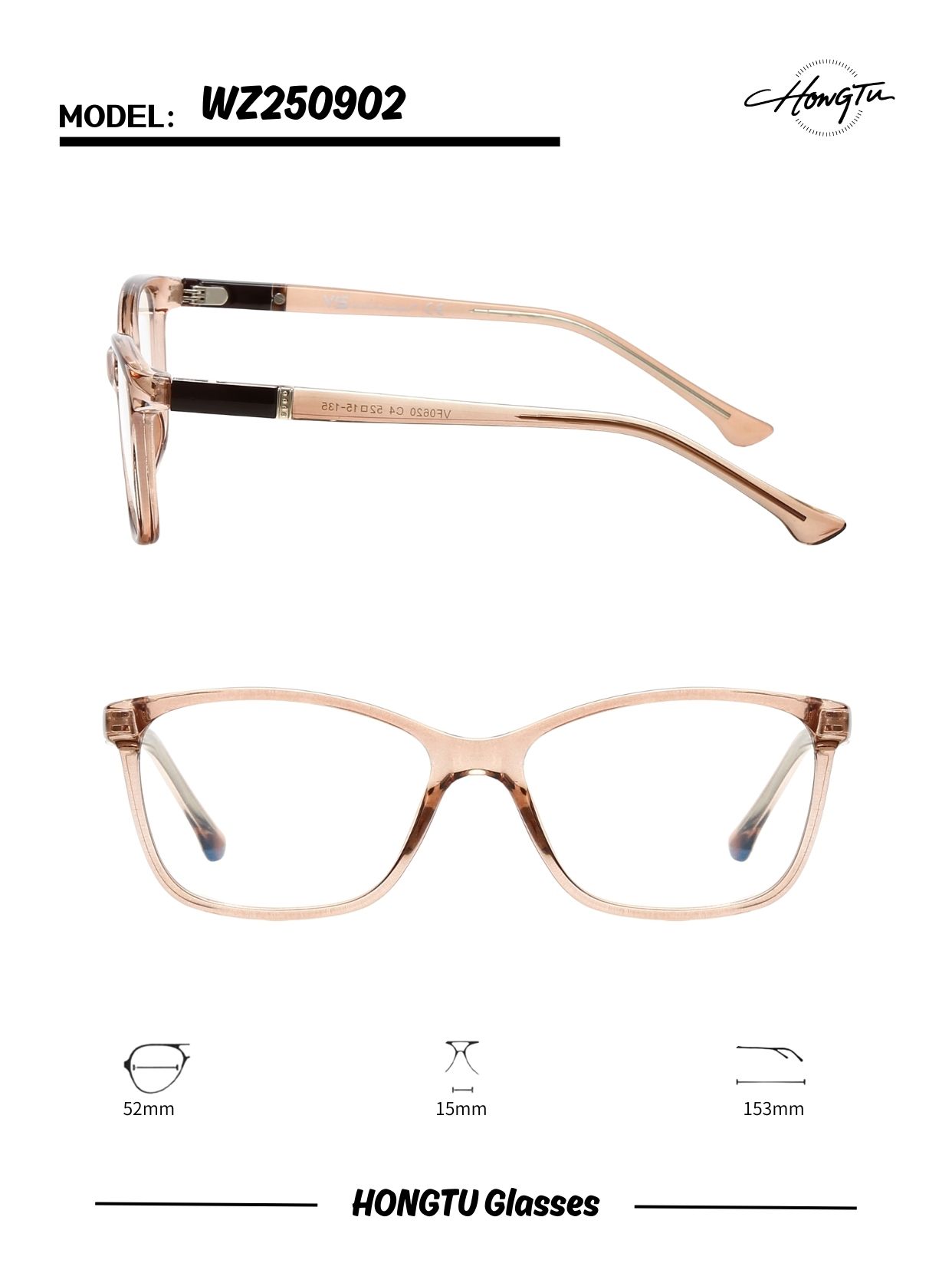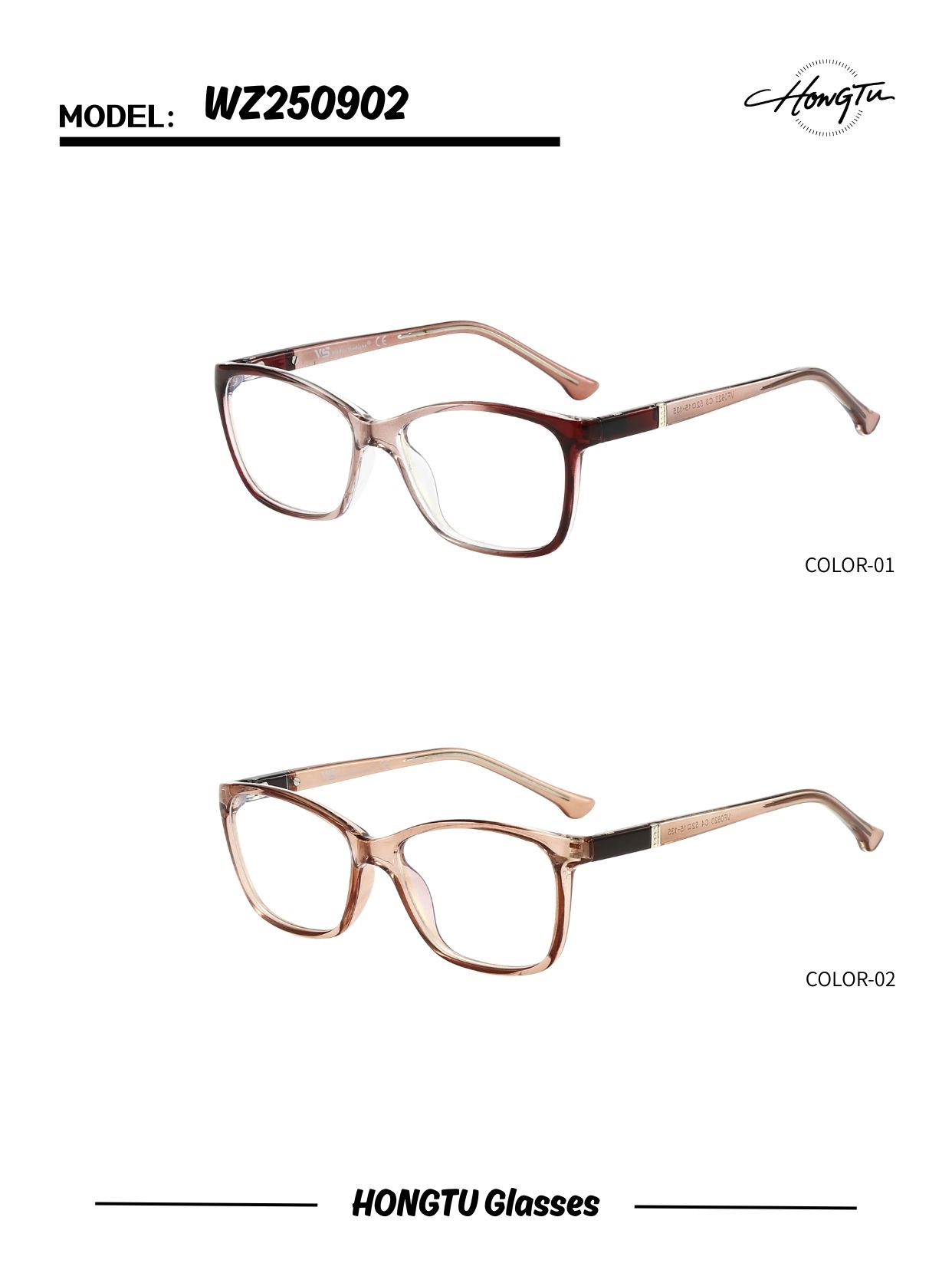HONGTU Glasses Model WZ250902 features a stylish and elegant frame design that flatters various face shapes. It comes in two exquisite color options, COLOR - 01 and COLOR - 02, allowing you to match different personal styles. With a frame width of 52mm, a bridge width of 15mm, and a temple length of 153mm, the glasses boast an ideal size ratio. Combined with lightweight and skin - friendly materials, they offer a comfortable wearing experience—their ergonomically designed temples fit the curve of the ears, ensuring no discomfort even after long - term wear. Whether for daily streetwear, office work, or study and reading, these glasses can enhance your look while being both aesthetically pleasing and practical.