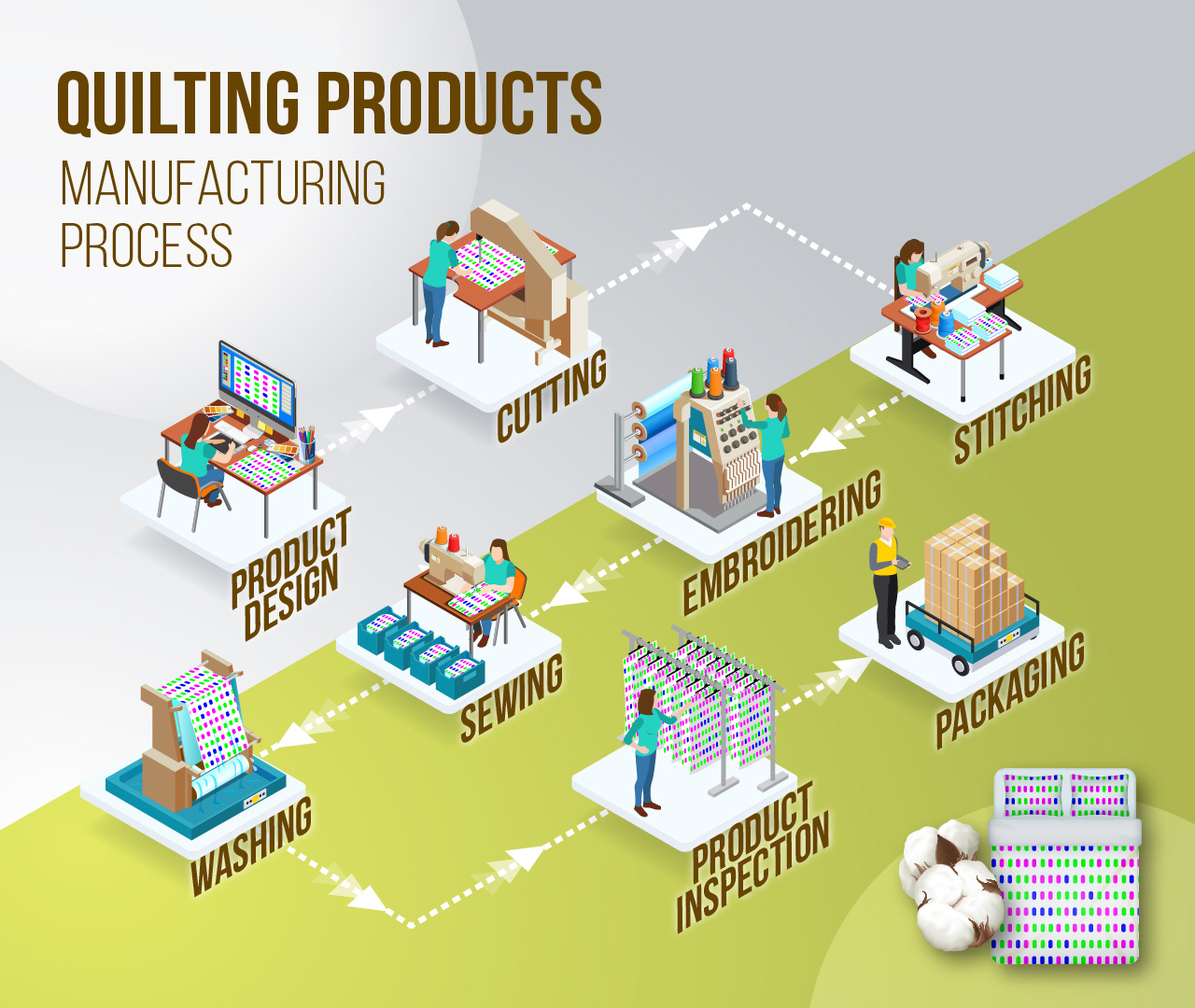 Pujiang’s quilting and home textile industry has developed from offering everyday products to handiwork and gifts, from home furnishings to clothing and household fabrics, reshaping the combination of household and home furnishing textiles with artefactual craftsmanship. The integration of technology with style and the transformation and upgrading of the quilting and home textile industry have achieved remarkable results and turned it into a major industry of Pujiang with its own characteristics. The industrial chain is led by key enterprises and backed by thousands of processing operators and tens of thousands of professional supporting teams. The industry starts with cotton yarn, cotton cloth, spray cotton and other raw materials to provide a one-stop production chain incorporating design, cutting, stitching, embroidering, sewing, washing, inspection and packaging.