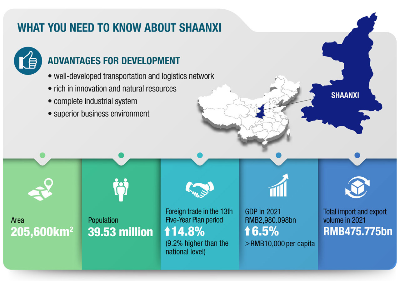 Geographically situated in the centre of China, Shaanxi Province was the eastern starting point of the ancient Silk Road. Today, Shaanxi is at the cutting edge of opening up in contemporary western China, as well as a centre for economy, innovation, culture and external communications. It boasts comprehensive advantages of building into a global advanced manufacturing base and becoming a region of reform and opening up in the inland of China