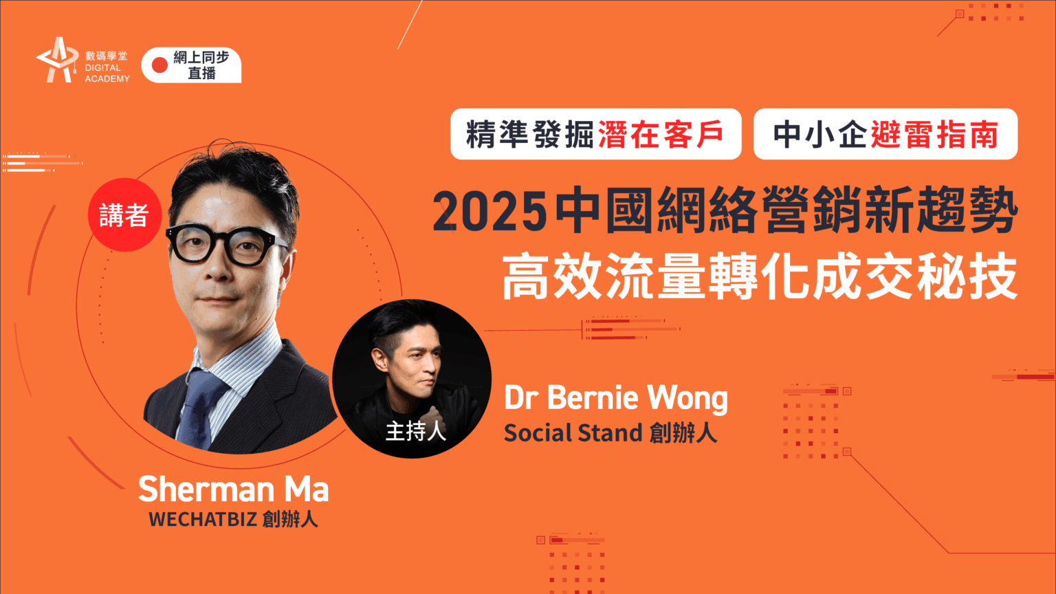 小紅書等內地社交平台高速發展,不少中小企都努力開拓新客源,如何將流量轉化為實際訂單,實現真正的商業價值?WECHATBIZ創辦人Sherman Ma,分析中國網絡營銷新趨勢,由開帳號到發帖文發掘潛在客戶,到最後成交簽單,一條龍全面教授。