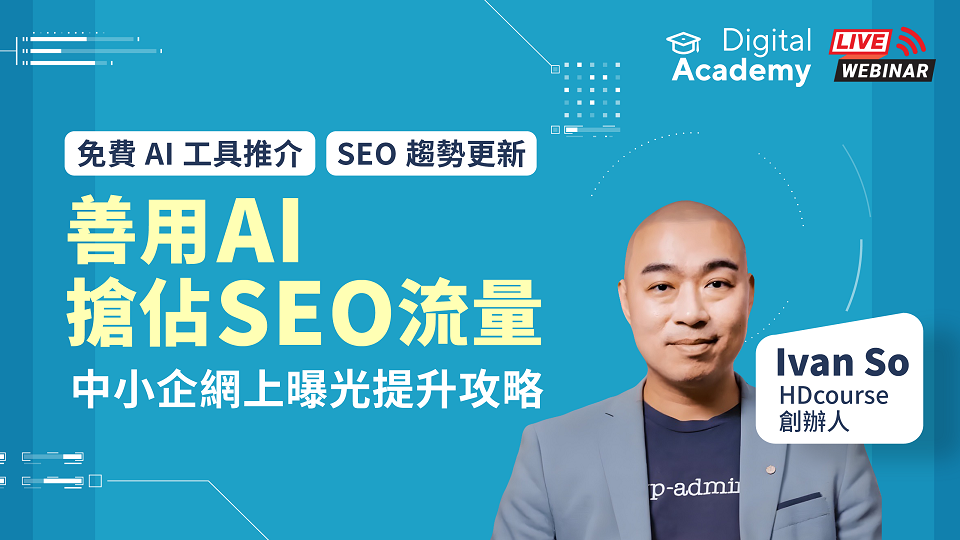 對於資源緊張的中小企來說,SEO流量是網上曝光的重要渠道,隨著AI生成內容愈來愈普及,用人手搶佔網上曝光已經過時!在鑽研SEO機制同時,如何配合AI改善公司網頁SEO表現成為關鍵。SEO專家HDcourse創辦人Ivan So,教大家用AI獲得大量SEO流量,更會推介好用易上手的AI工具。