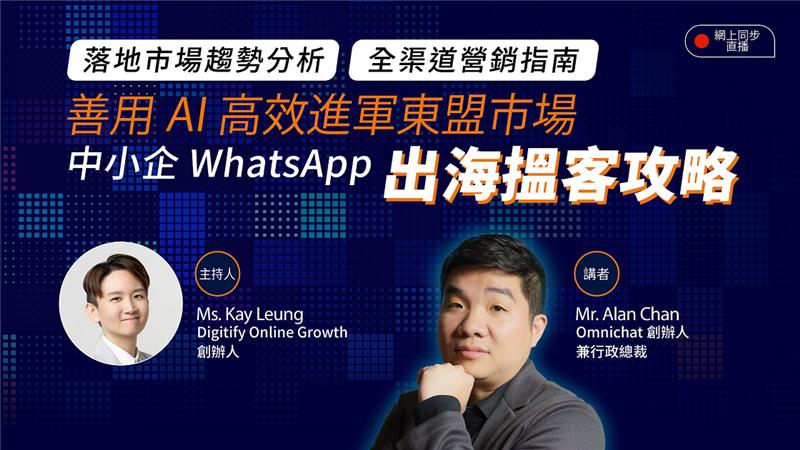 想進軍東盟市場,但客戶溝通效率低下、推廣成本高企、銷售轉化不如預期、甚至不懂選擇合適的行銷平台?Omnichat創辦人及行政總裁Alan Chan,為你深入剖析AI即時通訊的最新趨勢,教授如何建立客服、行銷與銷售流程,更會分享實戰案例,讓您學以致用。