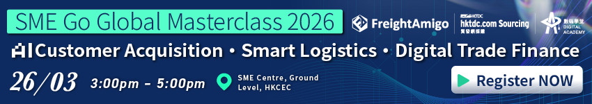 To support SMEs in digital transformation and smart logistics application, HKTDC Digital Academy will be organizing a physical seminar titled SME Go Global Masterclass 2026: AI Customer Acquisition • Smart Logistics • Digital Trade Finance on 26 March, 2026 at the Hong Kong Convention and Exhibition Centre, featuring: