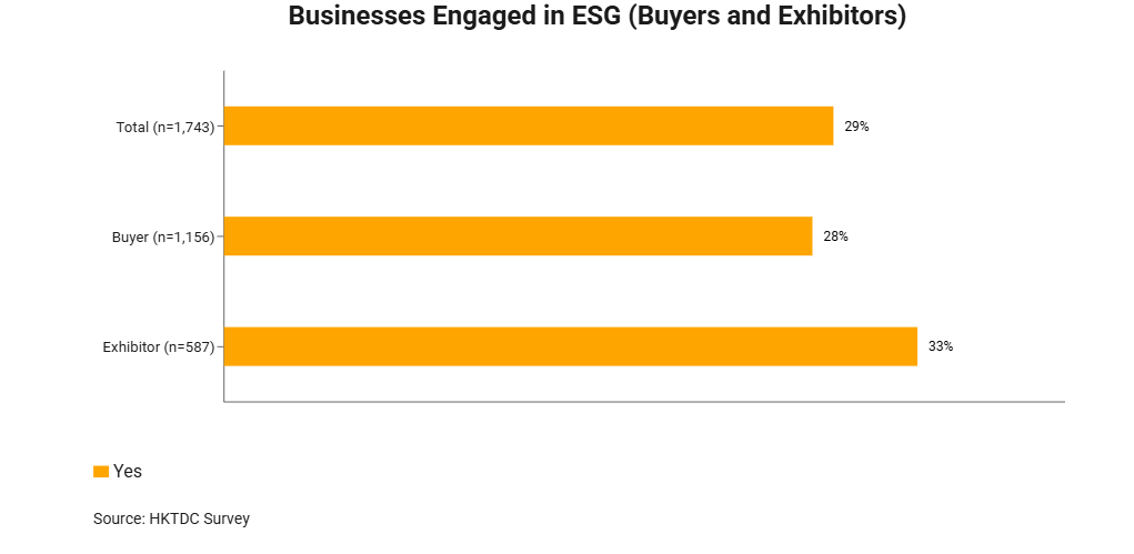 Despite this strong commitment, only 29% of businesses actively buy or sell ESG-compliant products or services, indicating room for growth in ESG trade activity.