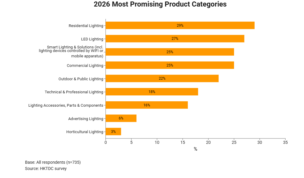 In terms of product categories with the highest growth potential, 29% of respondents saw residential lighting as the frontrunner, followed by LED lighting (27%) and smart lighting and solutions (including lighting devices controlled by WIFI or mobile apparatus) (25%).