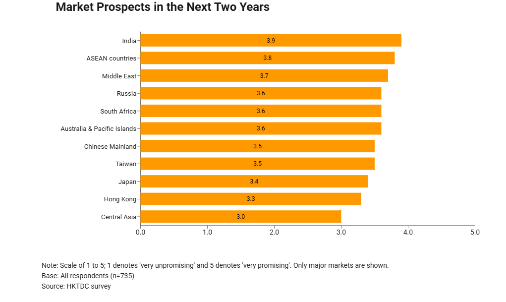 In terms of the outlook for individual markets, optimism was particularly high in the case of many of the emerging economies. When asked to rate markets on a scale from ‘1’ (‘very unpromising’) to ‘5’ (‘very promising’), respondents saw India (3.9) as the most likely to grow over the next two years, followed by the ASEAN bloc (3.8) and the Middle East (3.7).