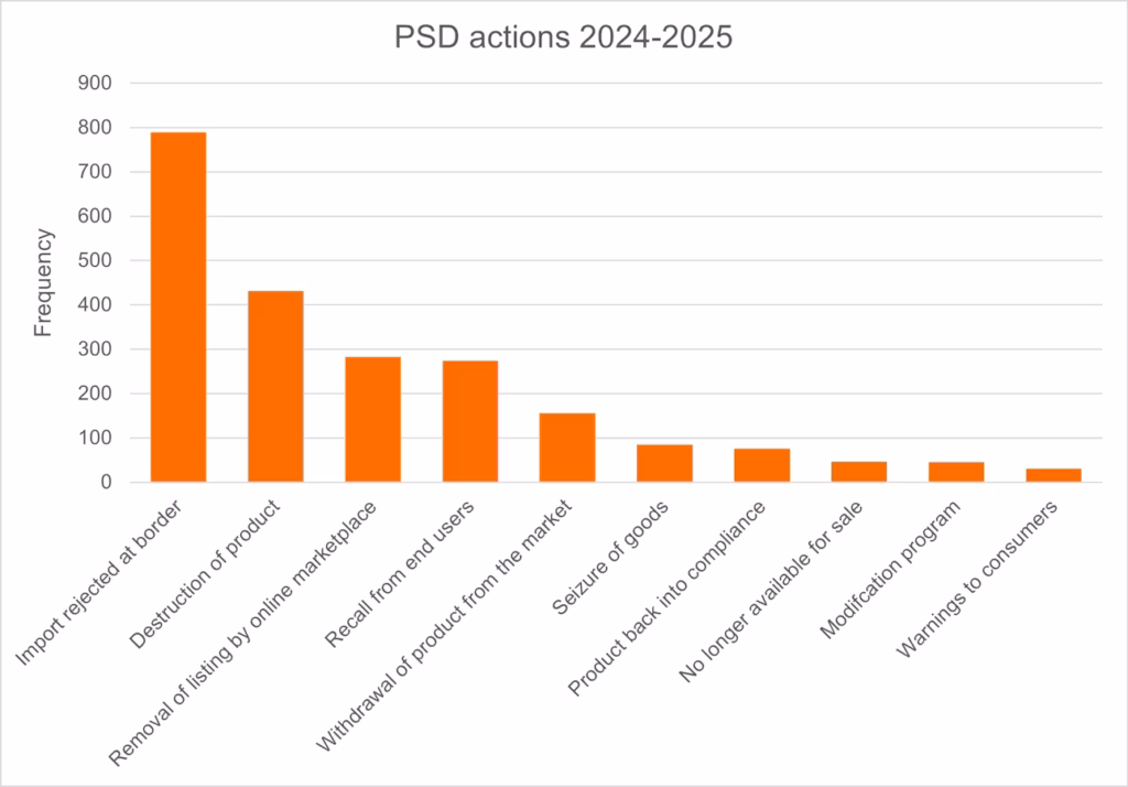 The following chart shows how authorities have responded to the findings in the PSD. The most common action was ‘import rejected at border’ (35%), followed by ‘destruction of the product’ (19%) and ‘removal of the product listing’ (13%).