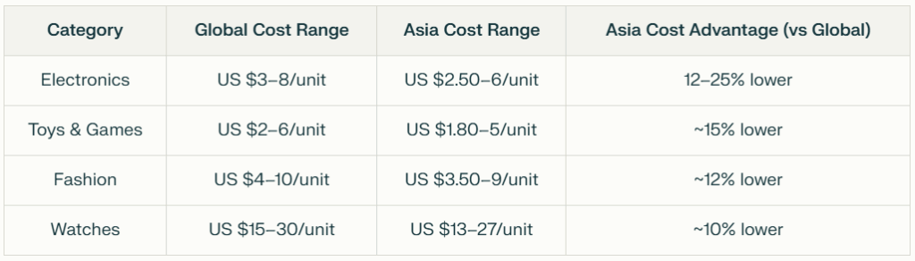 To help you benchmark costs across regions, the table below outlines typical price ranges for four key product categories. Compare global averages with Asia’s cost-effective rates to identify the best value propositions for your sourcing needs. The cost advantage column shows how much you can save by sourcing from Asia compared to global markets.